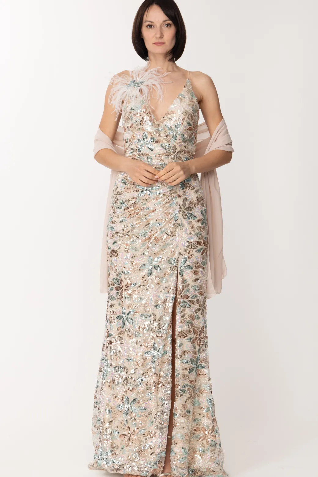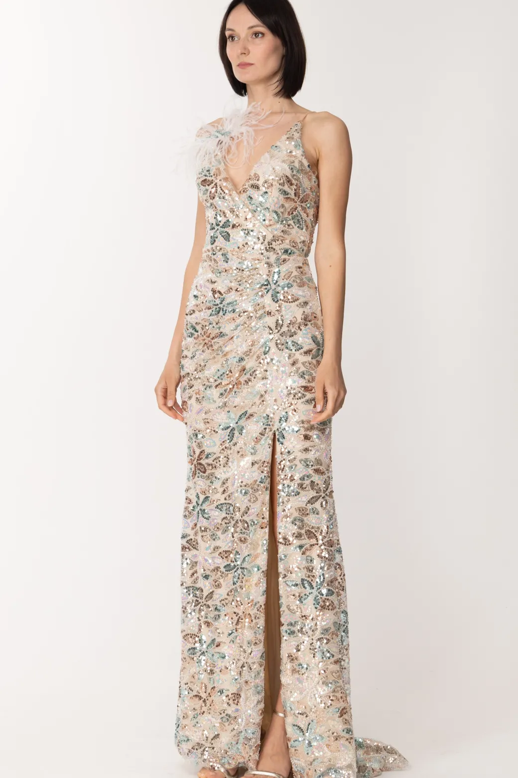 Fabiana Ferri Abito Lungo con Paillettes e Accessorio Di PiumeSALVIA