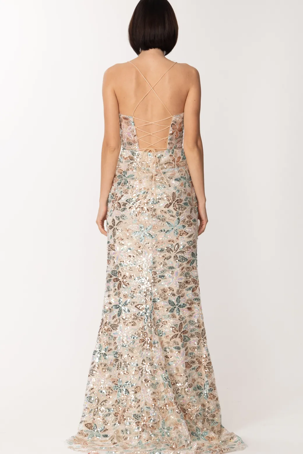 Gli abiti Fabiana Ferri sono sinonimo di eleganza, un’eleganza che unisce alla classicità delle sue linee l’originalità dei suoi dettagli, rendendoli perfetti per i tuoi eventi più importanti. Questo modello, dal taglio lungo e fit aderente, si caratterizza per il suo tessuto paillettato con fantasia floreale che dona estrema lucentezza, per la profonda scollatura a V, spalline che si incrociano sul retro con allacciatura a mo di corsetto, un accessorio di piumette sulla spalla e il vertiginoso spacco laterale che slancia la figura. Tutti gli abiti Fabiana Ferri sono accompagnati da stola abbinata.
