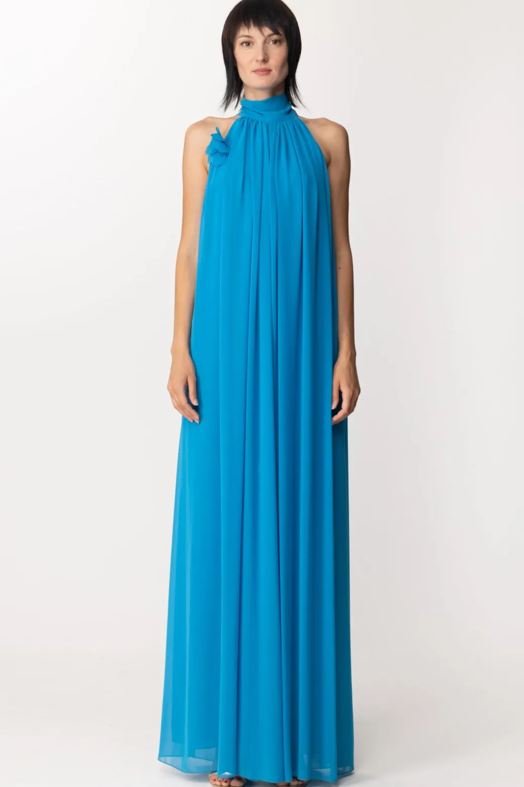 Tuta Fabiana Ferri caratterizzata dall’abbondante plissettatura che parte direttamente dallo scollo all’americana, con un bel fiore appuntato al colletto. Un’alternativa all’abito da cerimonia, proposta in colori sgargianti, da valorizzare con tacchi alti e completare, a piacimento, con una cintura gioiello al punto vita per dare maggiore risalto alla silhouette all’occorrenza.
