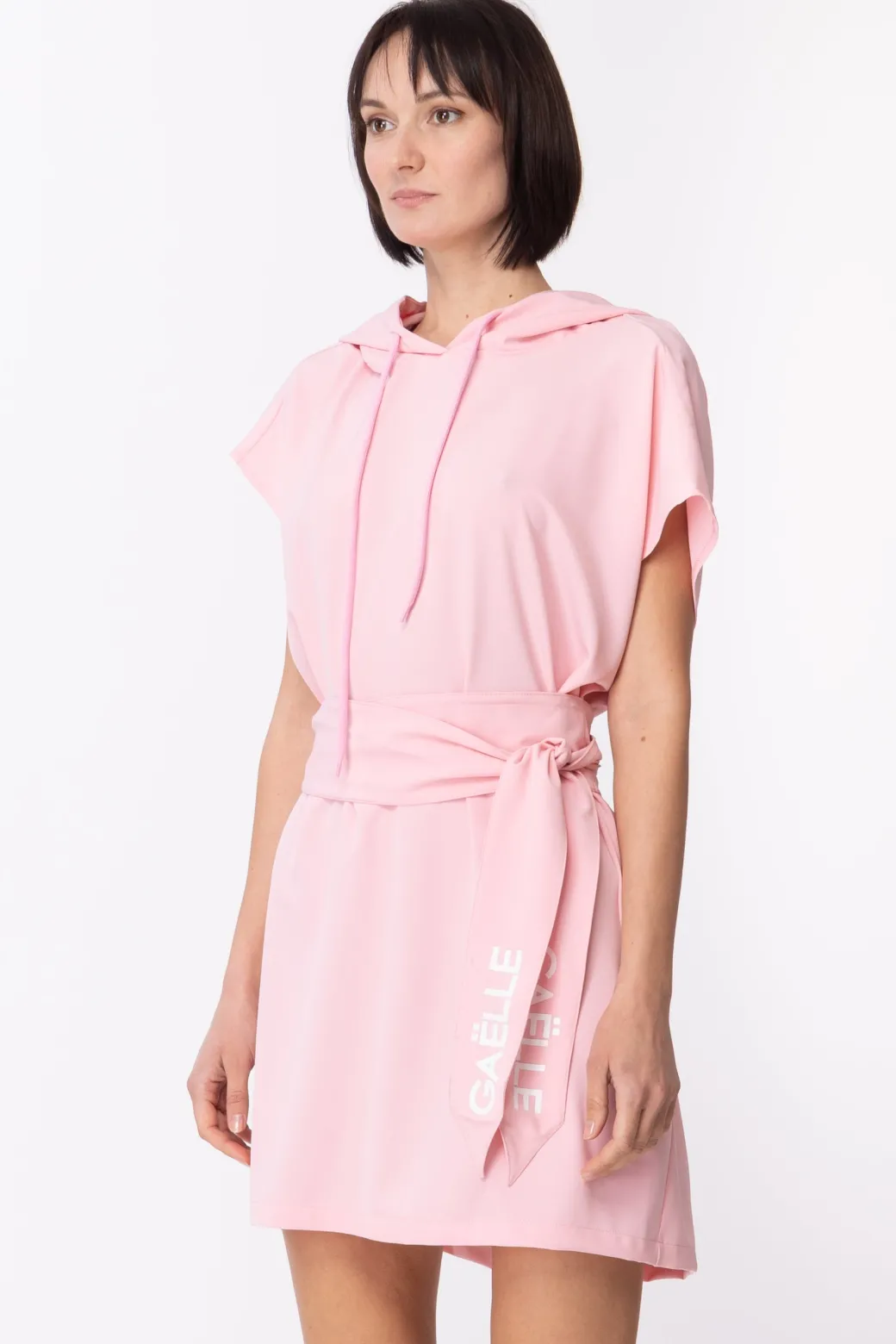 Sportivo e sempre chic, impossibile non averlo! Un mini dress Gaelle perfetto per i look freschi e comodi adatti a tutti i gioni, ha un design che ricorda una felpa, completo di cappuccio, maniche ampie e fusciacca in vita da annodare con logo a contrasto. Perfetto con sneakers e zainetto in spalla!