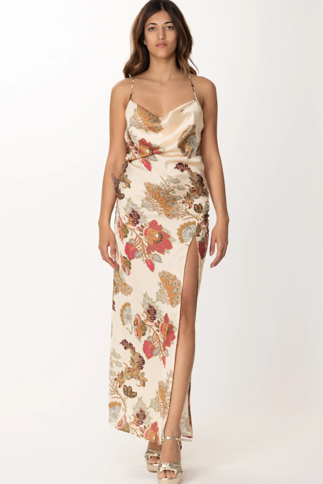 Abito Gaelle fresco ed elegante, interamente realizzato in satin, con un design che cade morbido e delicato sulla silhouette e viene abbellito da una colorata stampa floreale e un sensuale spacco laterale, perfetto per il mood estivo.