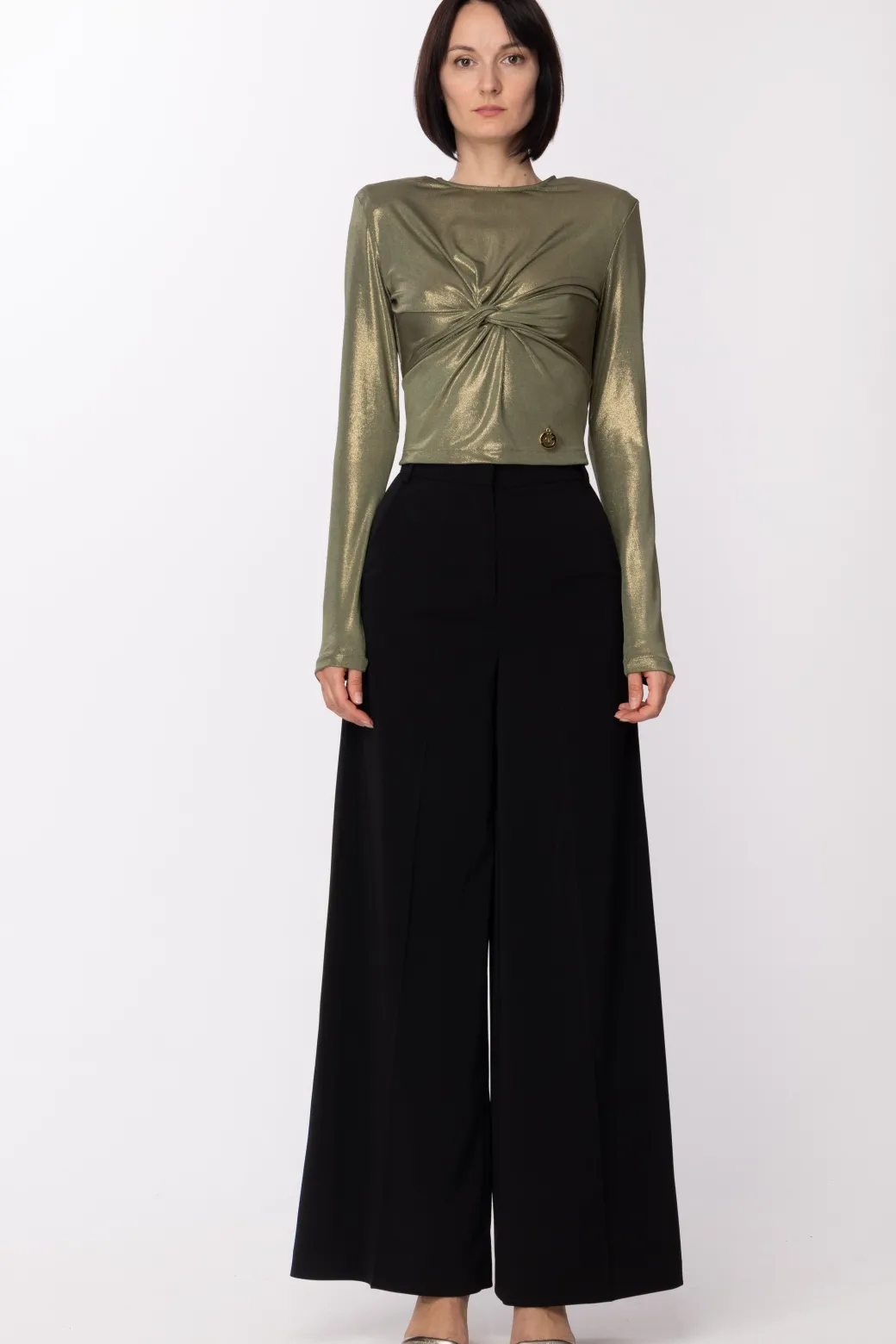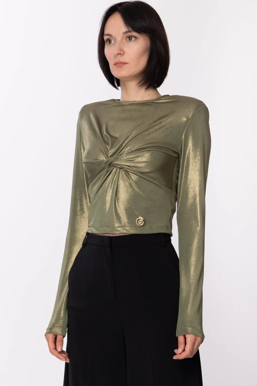 Gaëlle Paris Maglia Laminata con Nodo e Oblò Sul RetroVERDE OLIVA