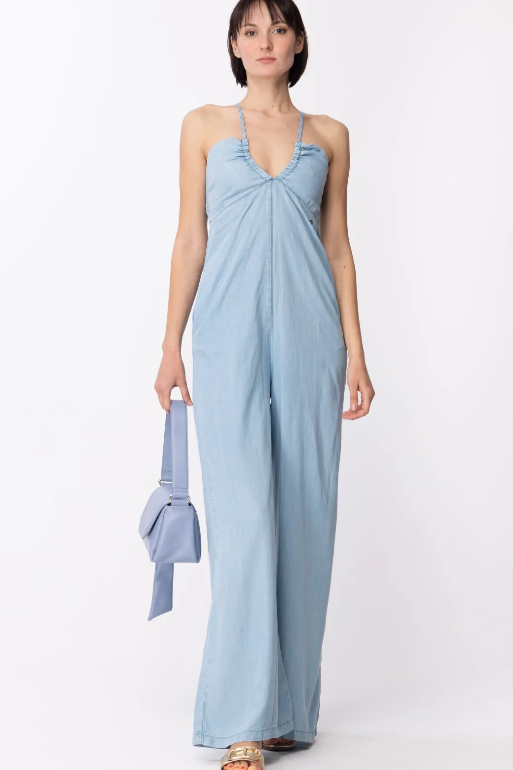 Un fit super comfy e uno stile sempre di tendenza: la maxi tuta Gaelle Paris sarà la tua compagna ideale per le giornaate estive, dal fascino fresco e leggero, caratterizzato da uno scollo con arricciature e pantaloni ampi e lunghi. Sandali ai piedi e tracolla completeranno l’outfit!