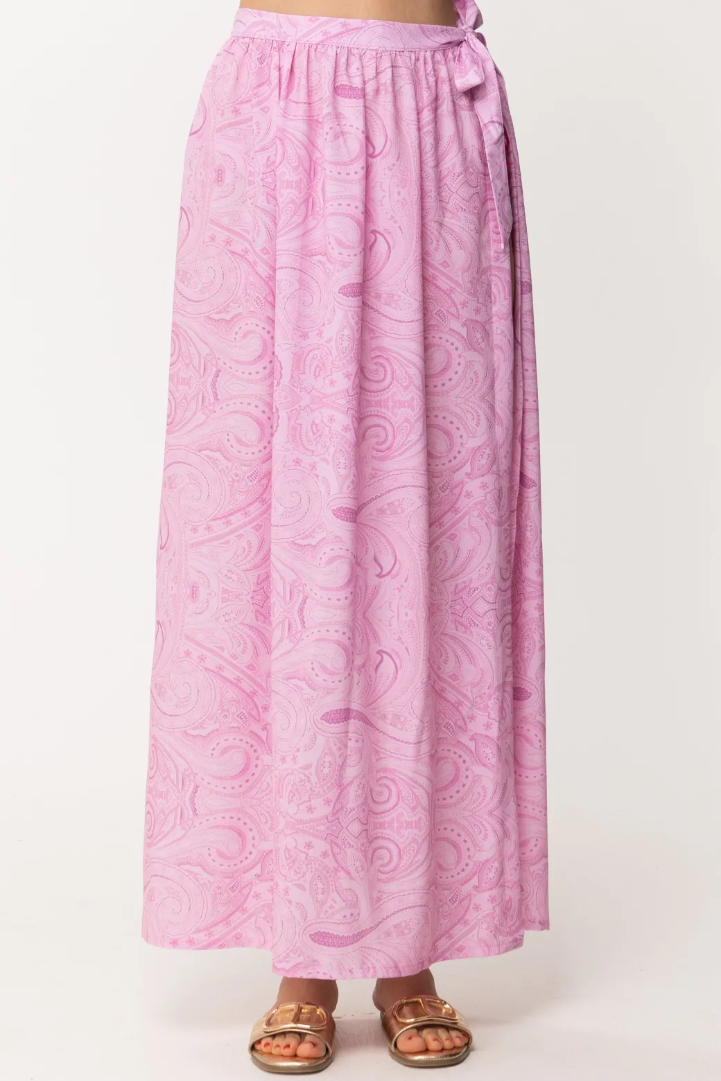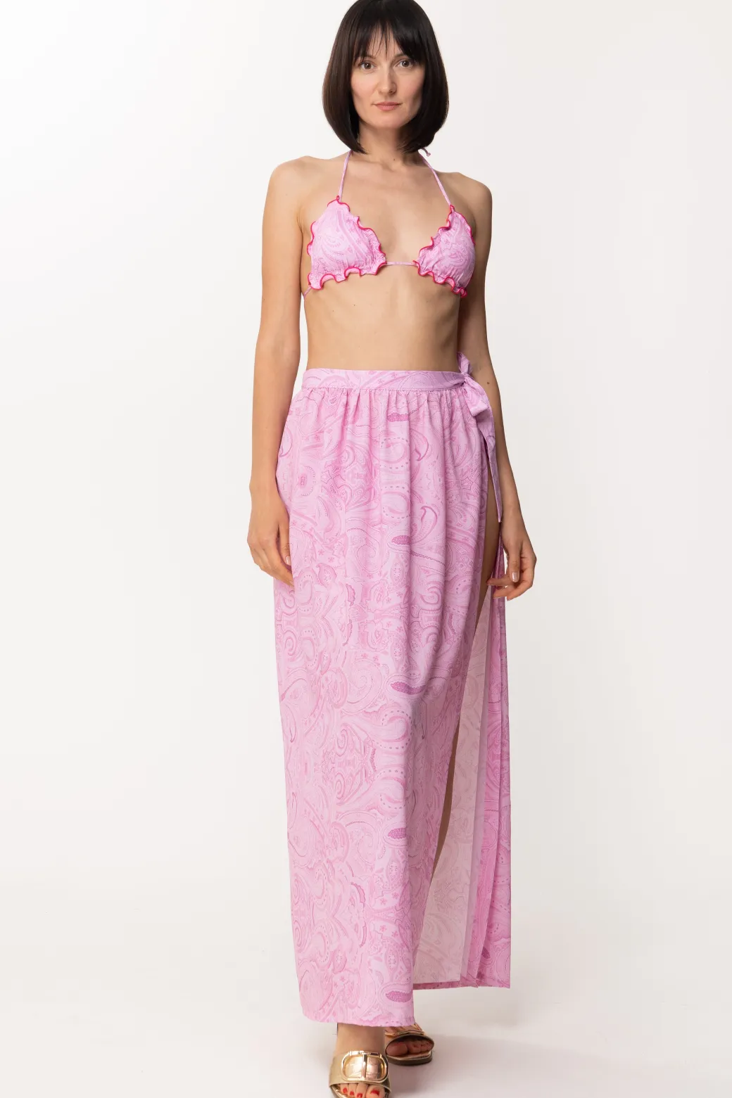 Un outfit da spiaggia non è nulla senza il suo pareo abbinato! Questo è firmato Gaelle e si presenta come una lunga gonna fresca e leggera da annodare su un lato, ha una fantasia tono su tono che la rende allegra e perfetta per il mood estivo!