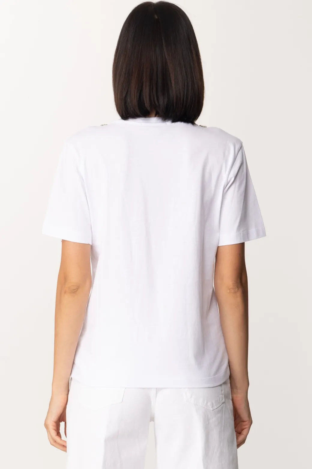 Basic, versatile ma di certo non anonima! T-shirt Gaelle Paris con maniche corte e girocollo ma soprattutto con l’applicazione di un accessorio a collana composto da tre fili di strass. Preziosa e chic con poco.