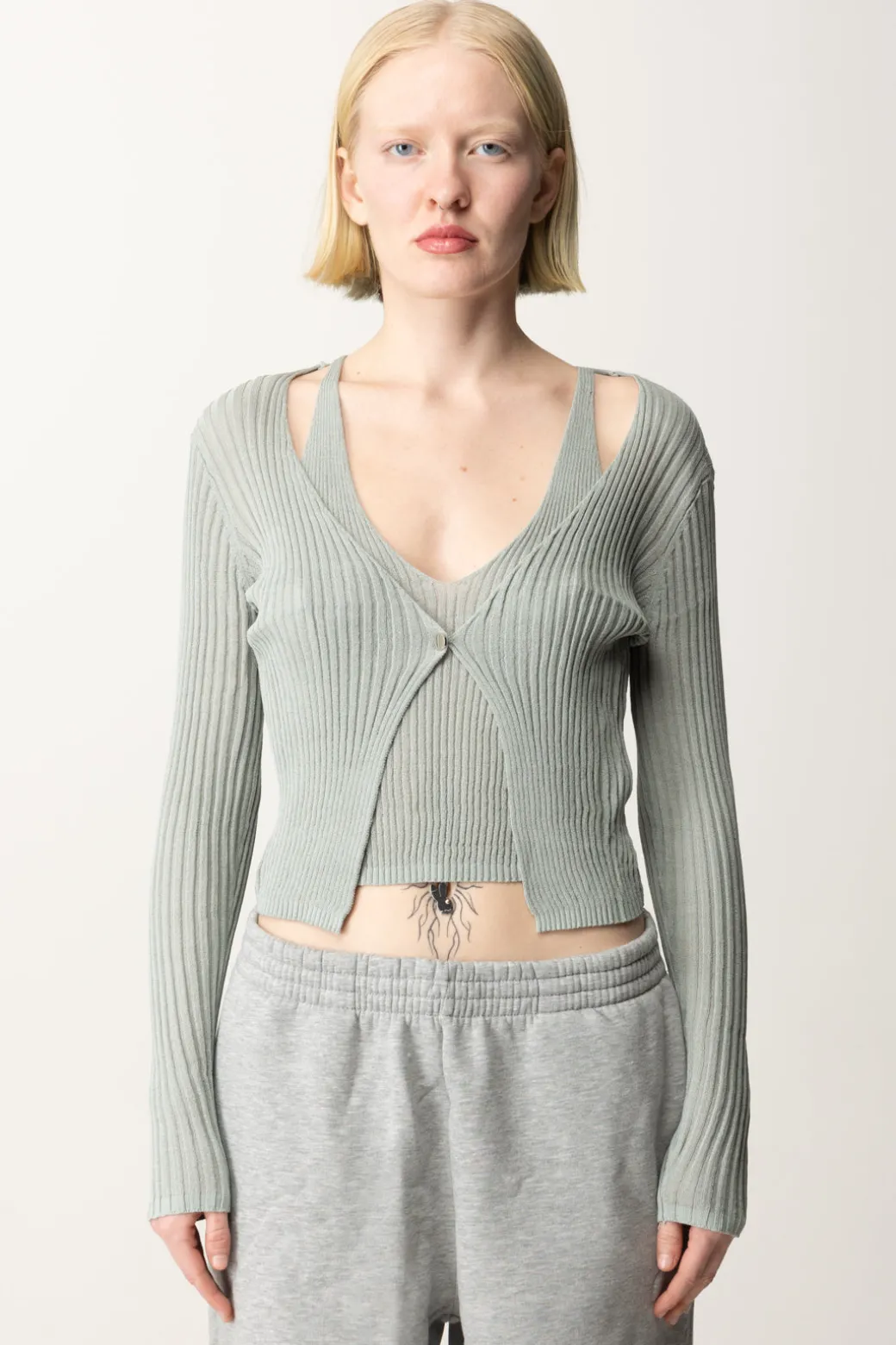 Un unico pezzo che ricrea l’effetto di un twinset, semplice e sofisticato al tempo stesso: maglia Guess realizzata a coste con design aderente e scollo a V profondo e dettaglio centrale con chiusura a bottone aggiunge un tocco di femminilità al look. Ideale da indossare su denim e bottom casual a cui aggiungere un tocco di delicatezza, o in combo con un pantalone sportivo per un look urban e originale.
