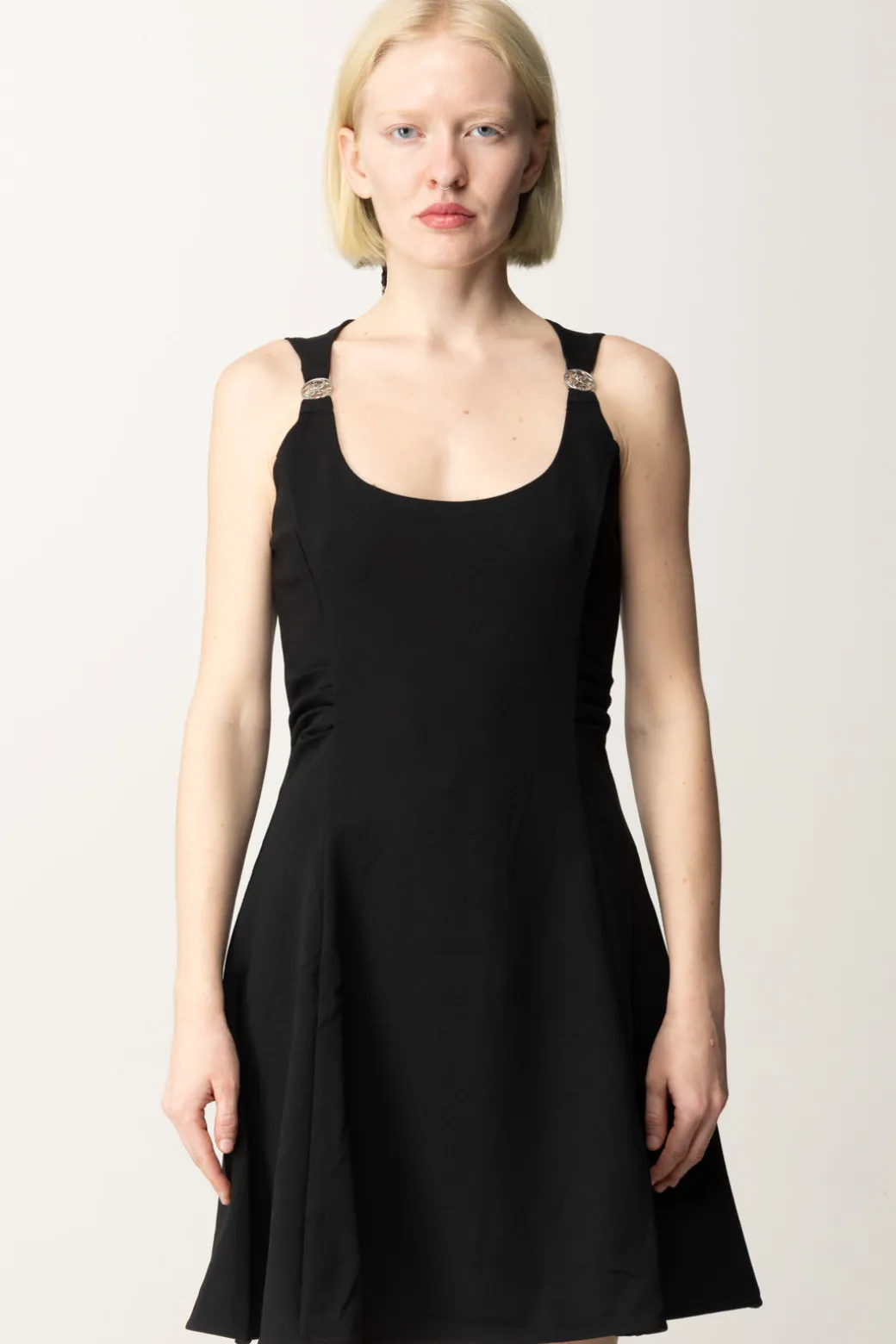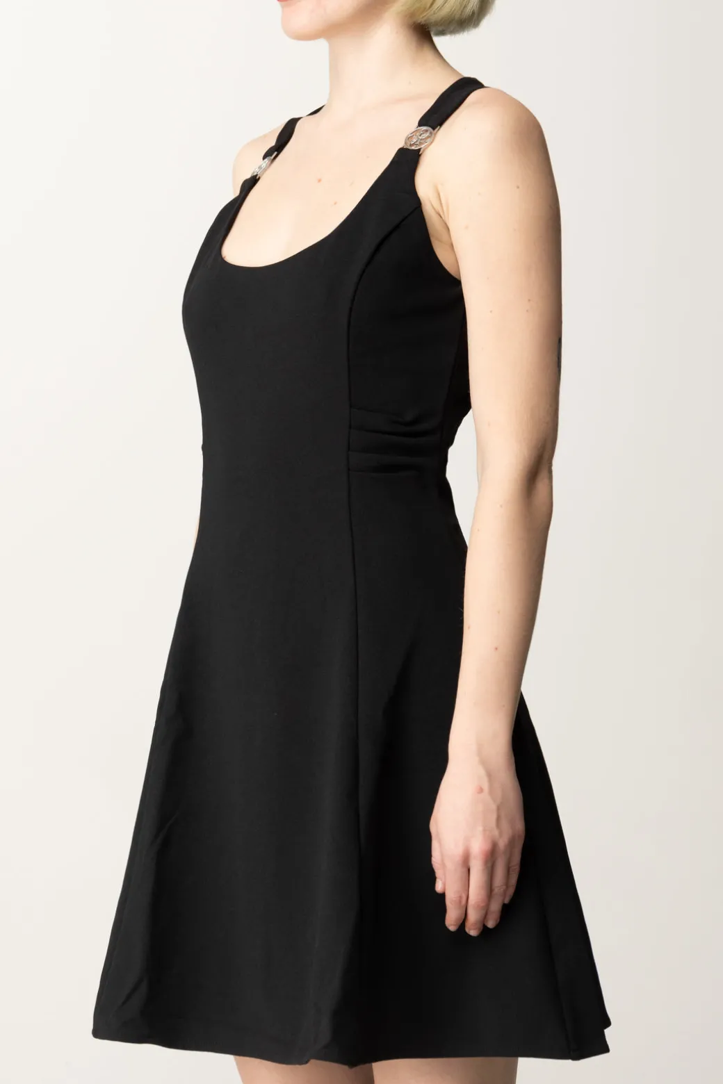 Abito corto Guess in stile coktail dress, elegante e femminile nella sua semplicità. Impreziosito da dettagli gioiello sulle spalline, che aggiungono un tocco sofisticato e glamour, la gonna svasata e il tessuto fluido garantiscono una silhouette perfetta per occasioni speciali o serate eleganti. Completa con un tronchetto per un risultato più frizzantino o con una decolletes per un look classico e chic senza tempo.