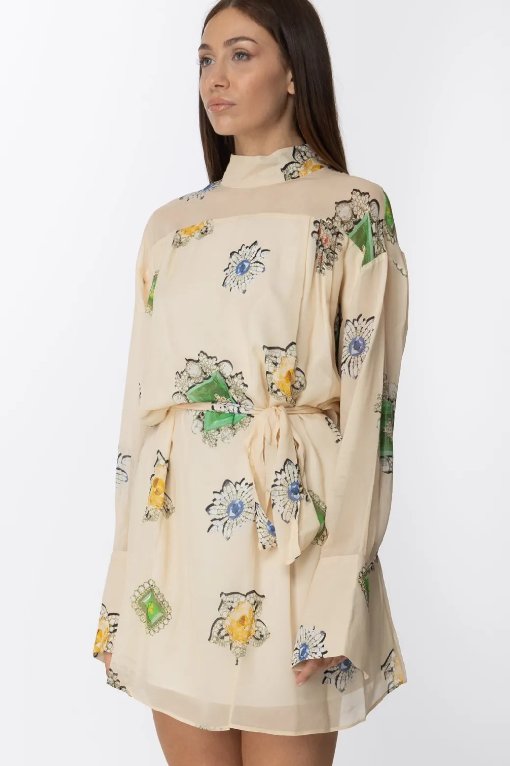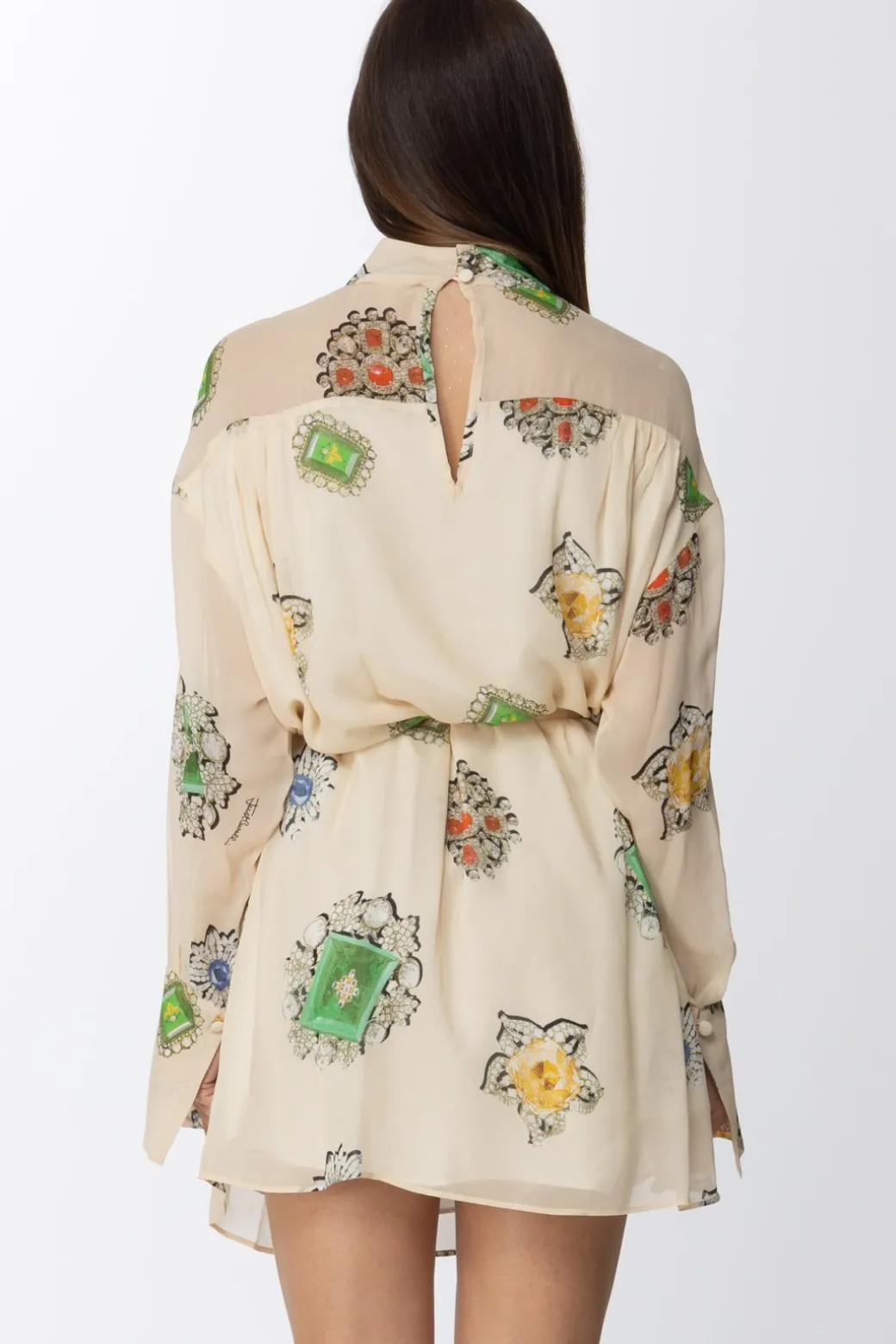 Mini dress Just Cavalli dal design femminile e dalla fantasia colorata: linea leggermente asimmetrica, evidenziata in vita da fusciacca annodabile, maniche a campana e colletto alto. Il tutto è completato da una fantasia di fiori e castoni dai colori vivaci che spiccano sul fondo. Ideale dal mattino alla sera, per un look contemproaneo ed elegante.