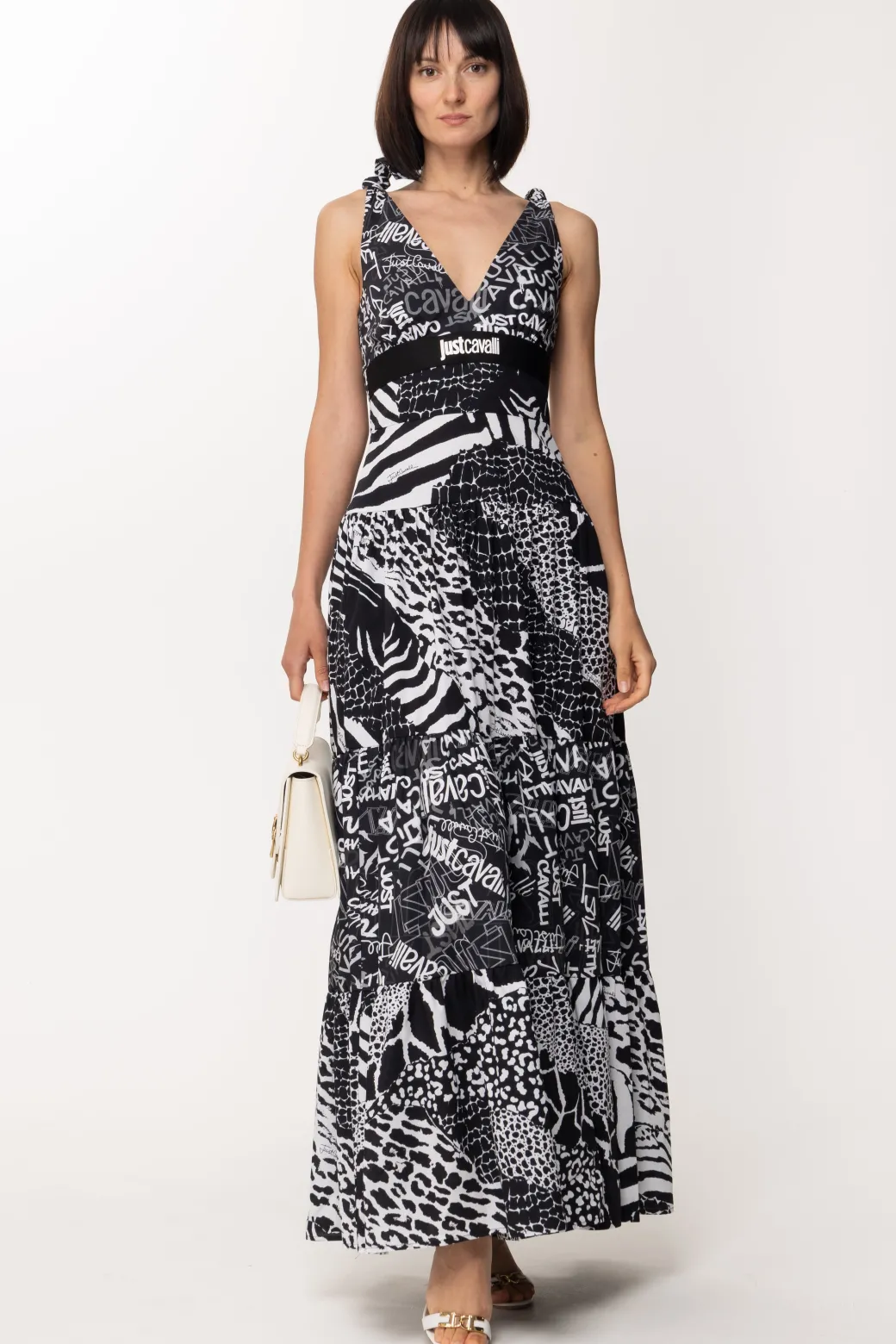 Una moltitudine di stampe si affolla su questo abito lungo Just Cavalli, come riporta il logo lettering al petto, con nodi sulle spalle e balze lungo la gonna svasata. Giocato con l’alternarsi del bianco e nero, puoi spezzare la bicromia con accessori a colori o fluo e vivere questo abito dalla sera alla mattina cambiando tacchi e dimensioni della borsa.