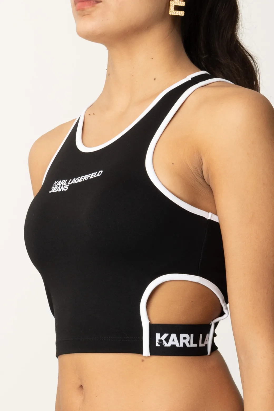 Un top Karl Lagerfeld sporty e versatile, caratterizzato da bordi a contrasto di colore, con dettagli cut-out sui lati e logo lettering in evidenza. è perfetto da abbinare a pantaloni joggers per un look athleisure o con una gonna a vita alta per un tocco glamour.