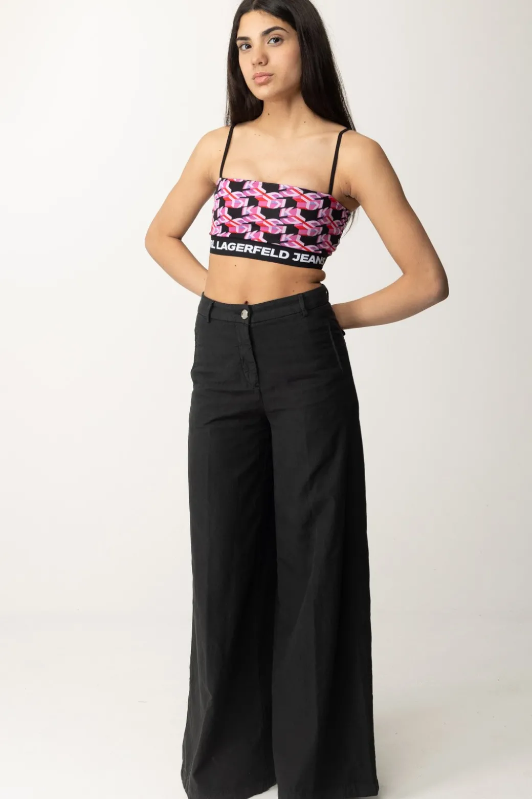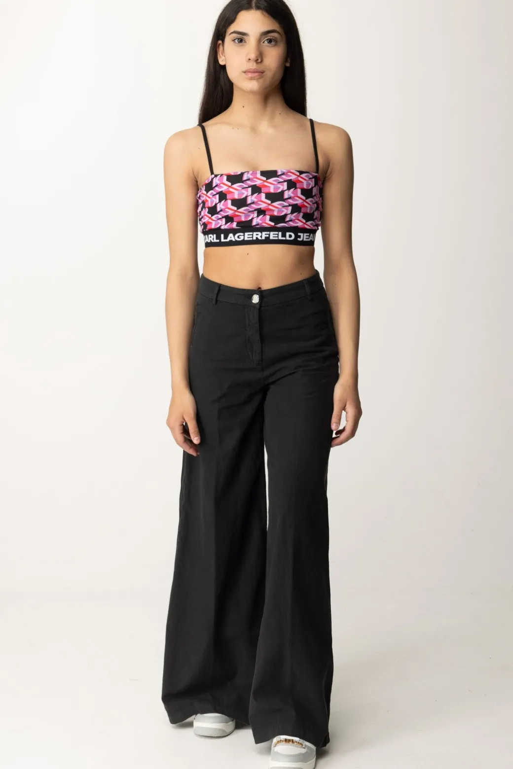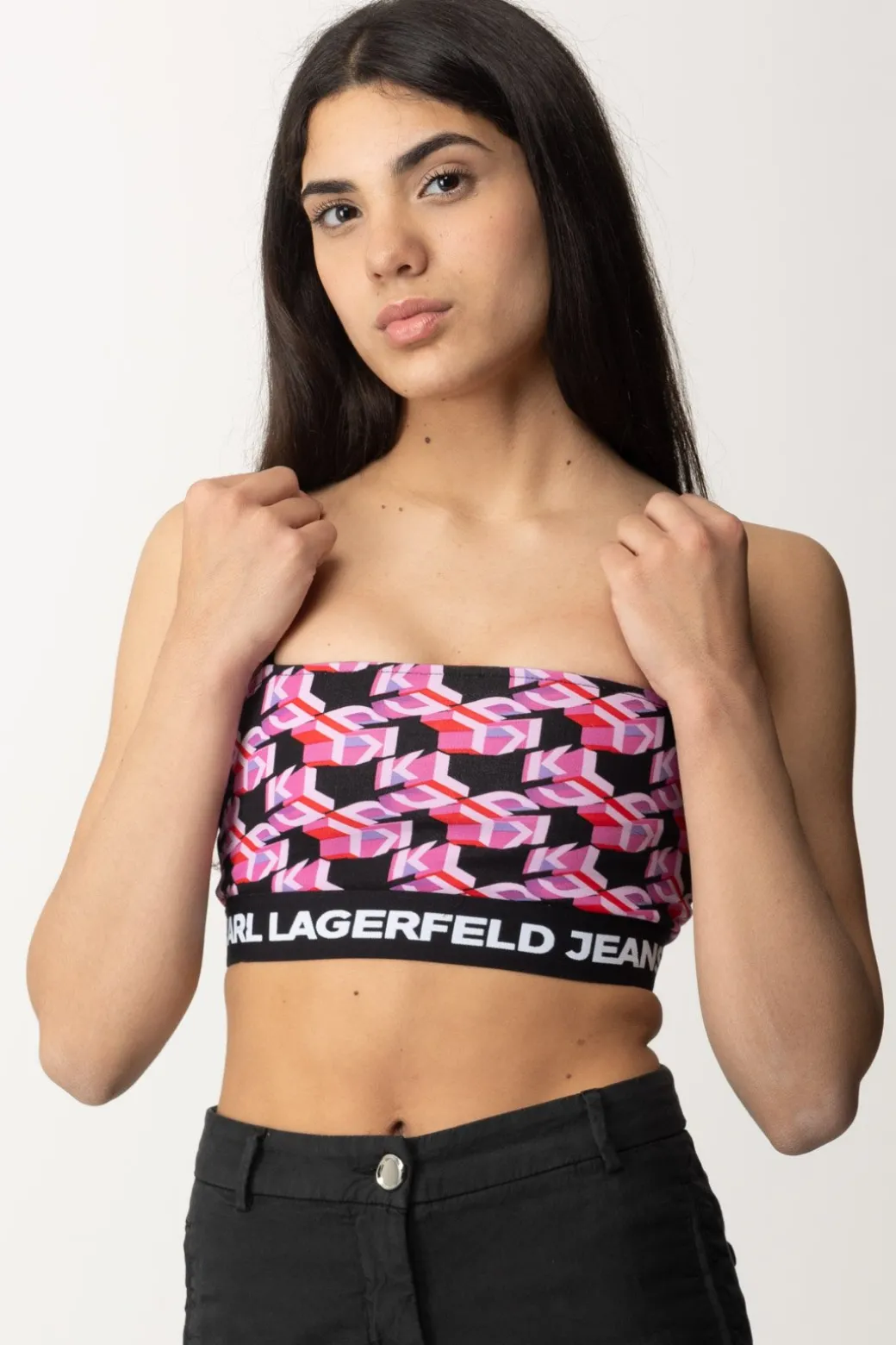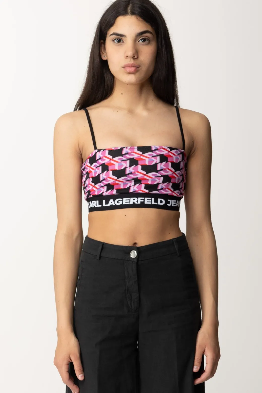 Con spalline regolabili e una fascia sul petto in evidenza, questo crop top Karl Lagerfeld ha una vestibilità aderente e uno stile distintivo per un look audace e alla moda da indossare sopra jeans abbinato ad accessori vibranti.