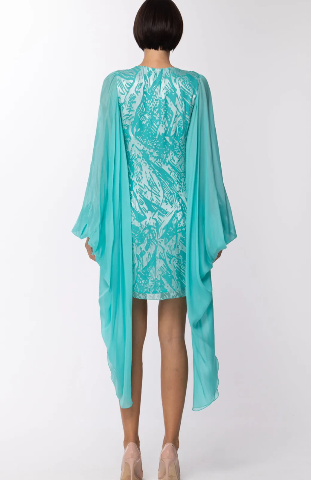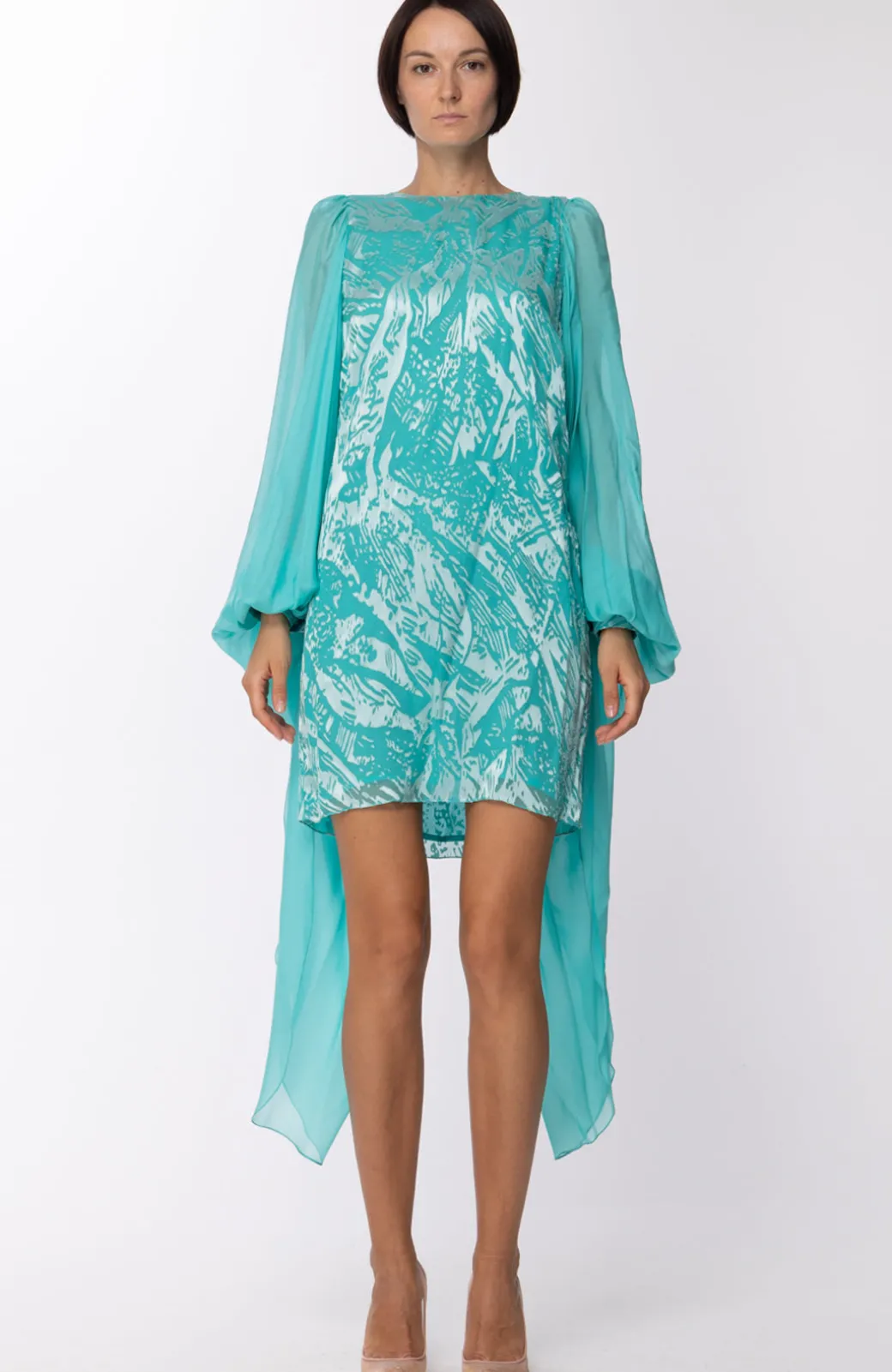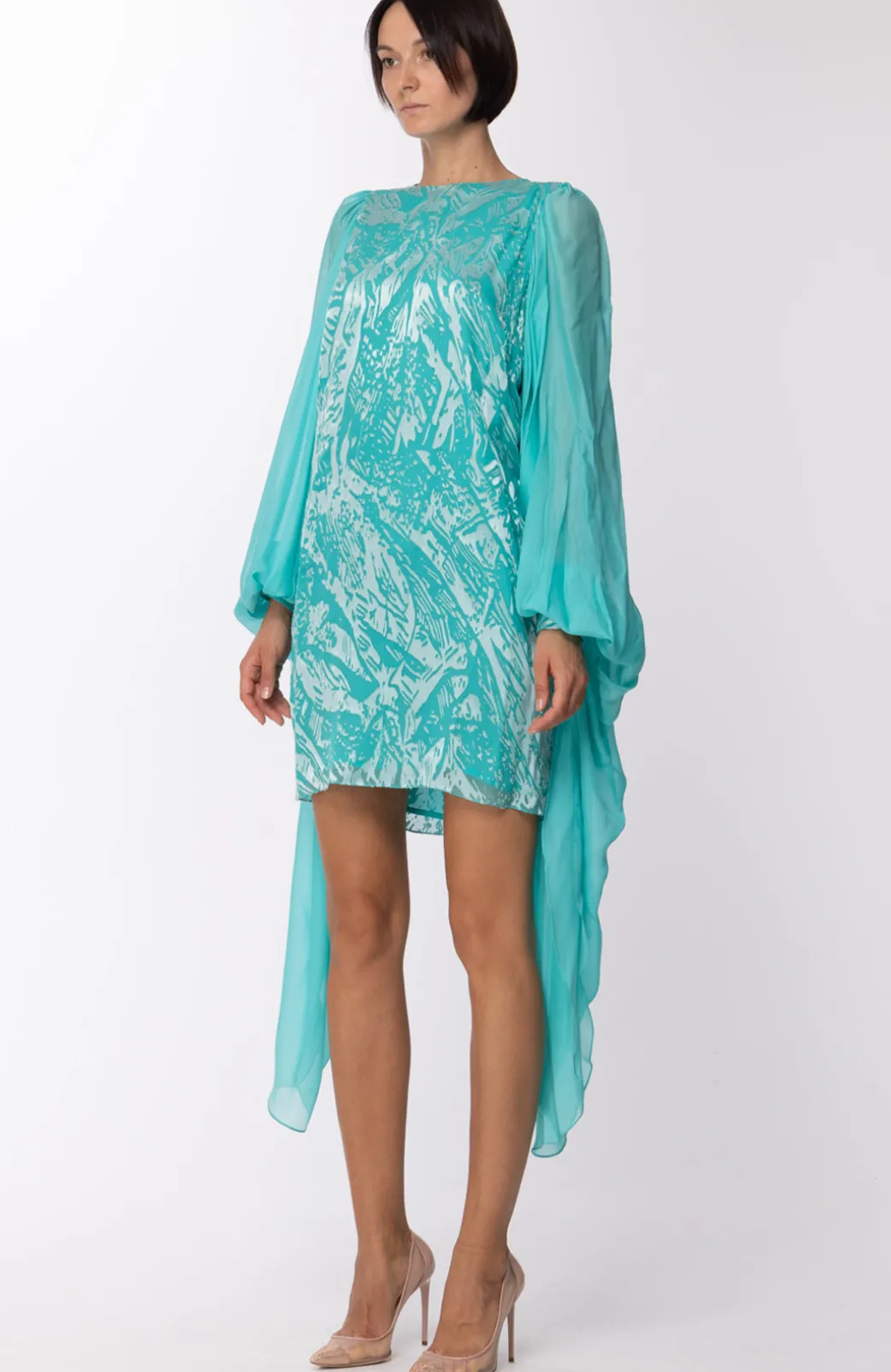 Un delizioso abito da cerimonia firmato Les bourdelles des garcones per la tua estate. Taglio corto e delicato girocollo, le maniche ampie e trasparenti riprendono il tono del tessuto e lo lasciano cadere soffice e caporoso inforno a te.