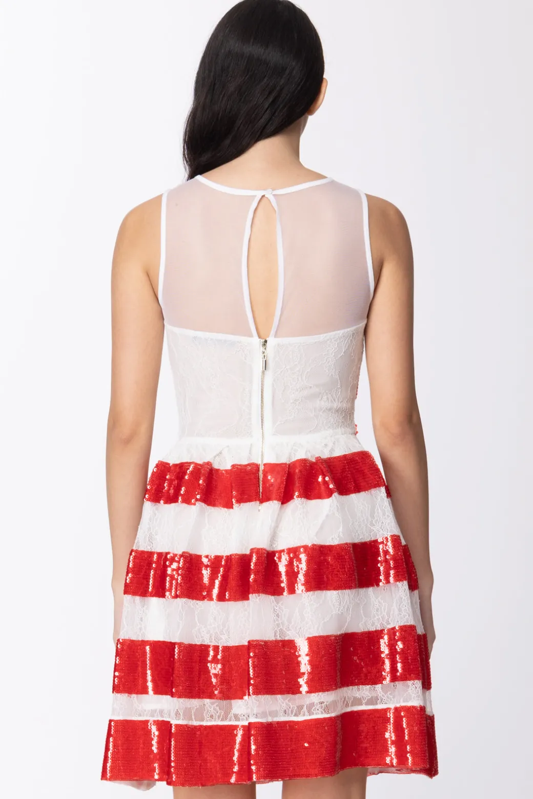 Mangano Mangano: Abito Garvey con Ampia Gonna a Pieghe In Pizzo Effetto Chantilly con Ricamo PaillettesOFFWHITE/ROSSO