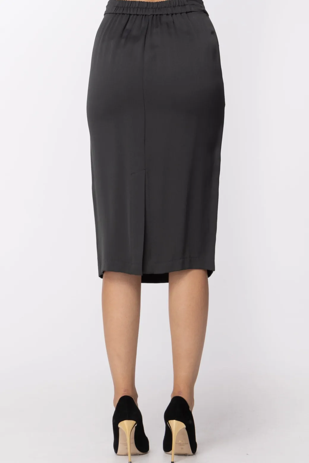 Una gonna dal design versatile, che ti permette di abbinarla ai più svariati look, da quelli formali a quelli più casual chic. Caratterizzata da un taglio midi, con cinturino elasticizzato che definisce il punto vita e spacco sul retro.