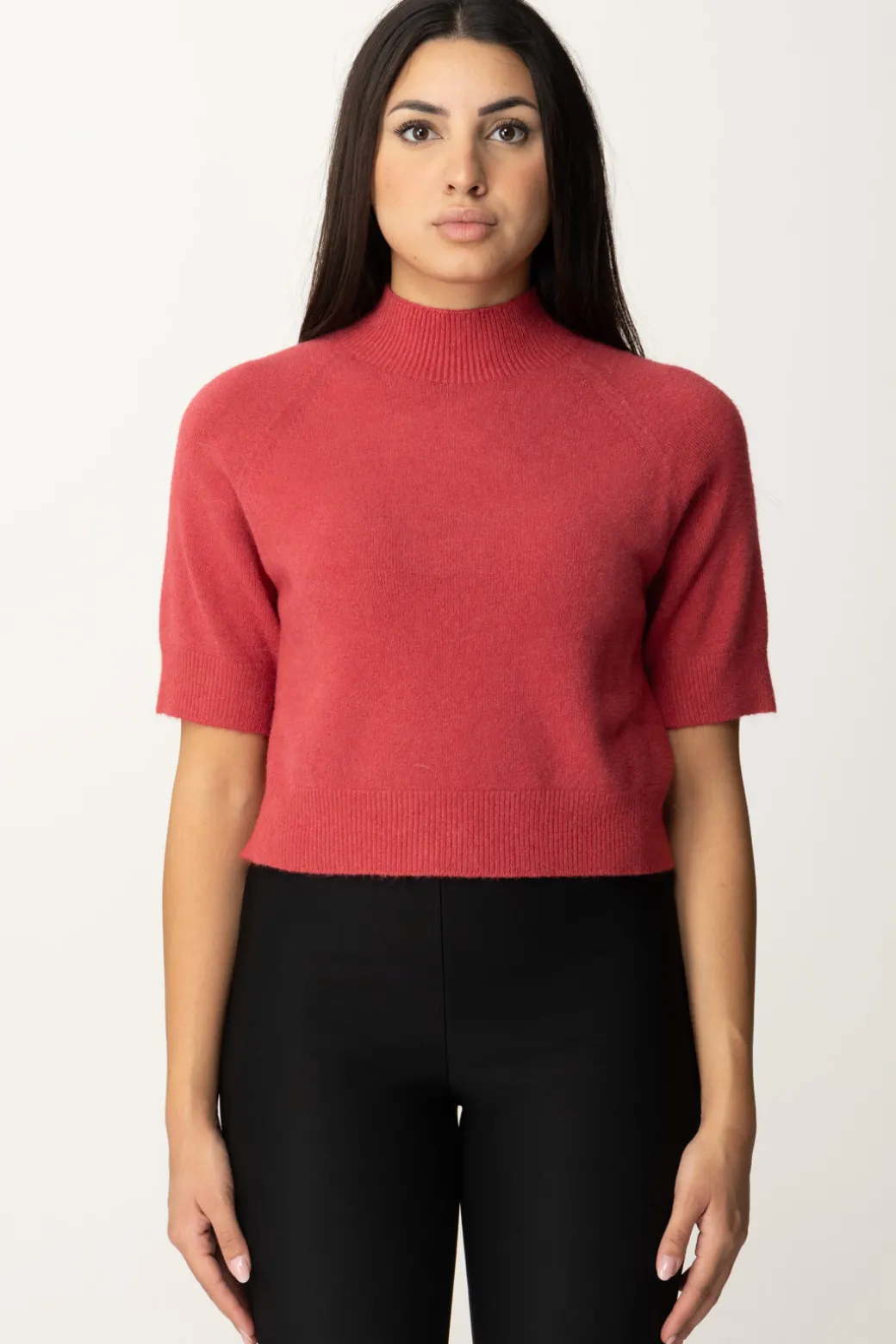 Versatile e femminile maglia Manila Grace in misto viscosa, con taglio crop che ben si presta a valorizzare la tua silhouette insieme a bottom a vita alta. Maniche corte e collo alto rifiniti con ordli a costine, un capo semplice e pratico per i tuoi look da tutti i giorni, da indossare anche in combinazione con blazer in lana e cardigan.