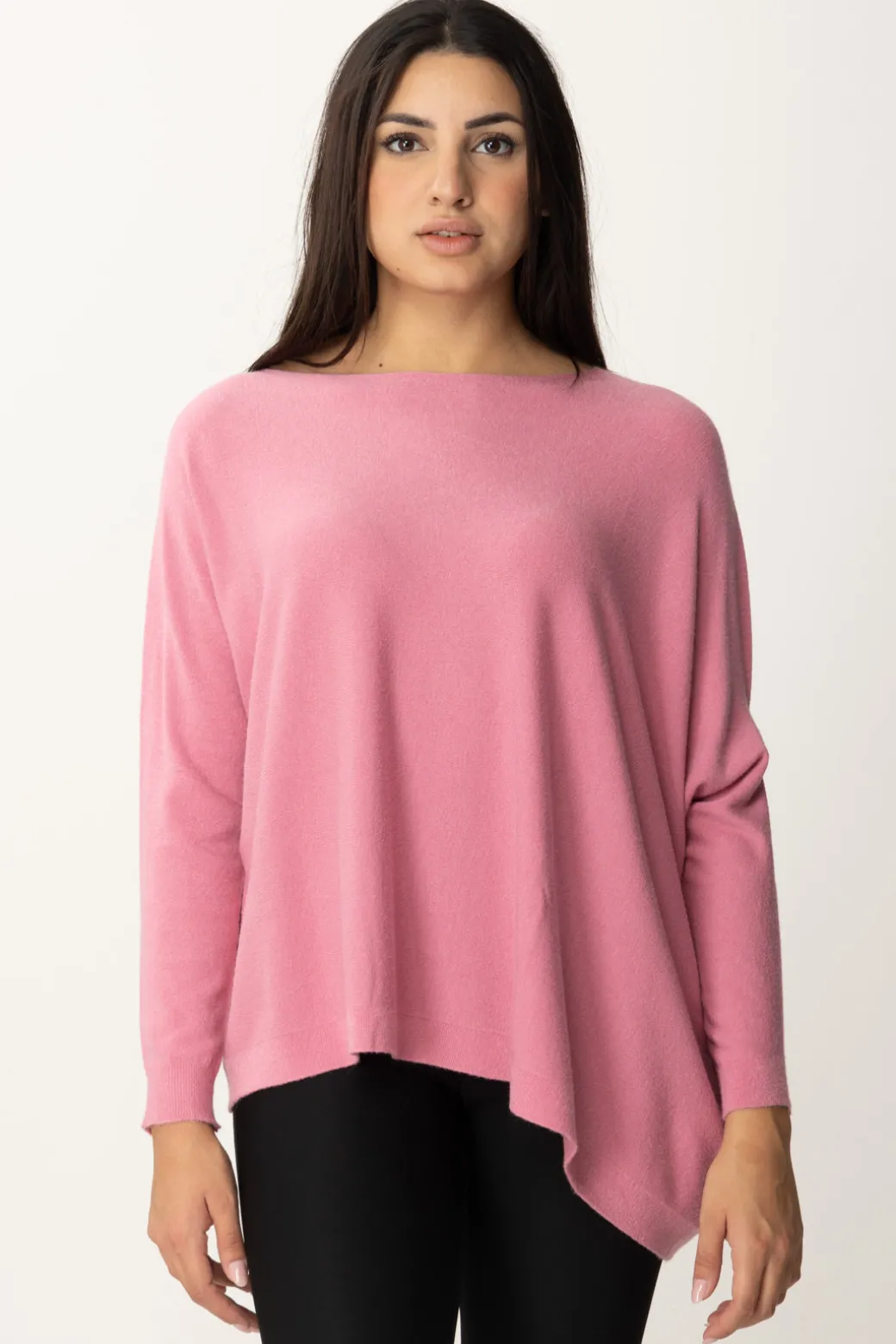 Se ami le vestibilità oversize e i tagli un po’ sopra le righe, allora devi assolutamente provare questa maglia poncho Manila Grace, con fondo asimmetrico e scollo a barca. È realizzata in misto viscosa con orli a costine ed ha una fit super comfort che ti permette di indossarla anche su altre maglie, o di giocare con i volumi dei tuoi outfit di stagione.