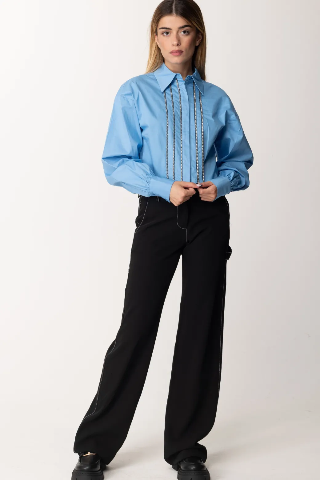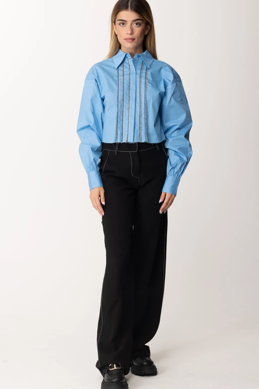 Questa camicia cropped con maniche a sbuffo e dettagli in strass è perfetta sia per le uscite pomeridiane, abbinata ad un jeans e un trench, ma anche in versione elegante per le occasioni serali abbinata ad una gonna o un pantalone nero con stivaletti. Versatile, comoda ma molto trendy!