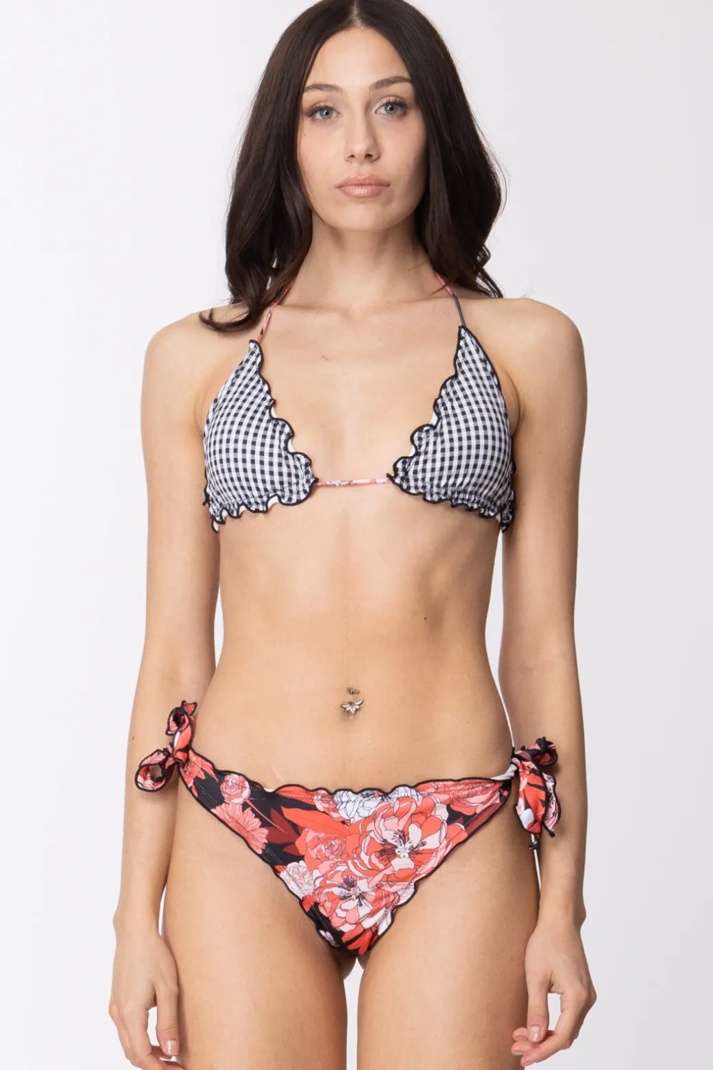 Linea: In BloomDoppia stampa per questo bikini Me fui, dove il motivo floreale dello slip è riportato sui laccetti del top a triangolo con orli arricciati. Chiusura regolabile con nodi per entrambi i pezzi così da garantirti il massimo della comodità nelle tue giornate a mare.Coppa con imbottitura estraibile86%Poliestere 14%ElastanConsigliato lavaggio a mano con acqua tiepida