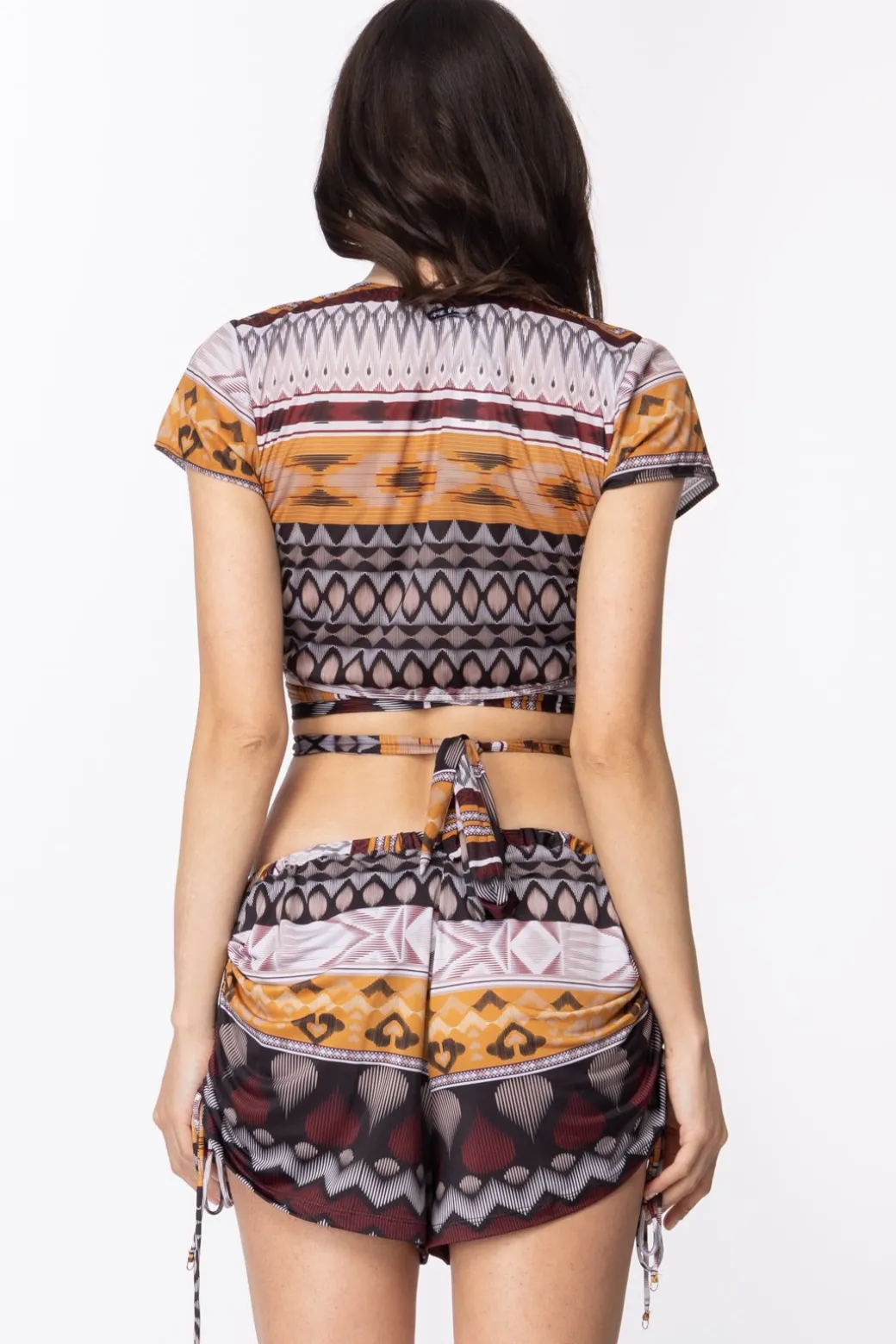 Alla moda e dallo stile boho-chic, questa crop top MeFui, realizzato in tessuto lycra a fantasia, allacciato con fusciacca sul retro e con anello metallico sul davanti, entrerà a far parte del tuo must-have per il tuo dailywear estivo, grazie al modello leggero che gli conferisce un design fresco e facile da abbinare.