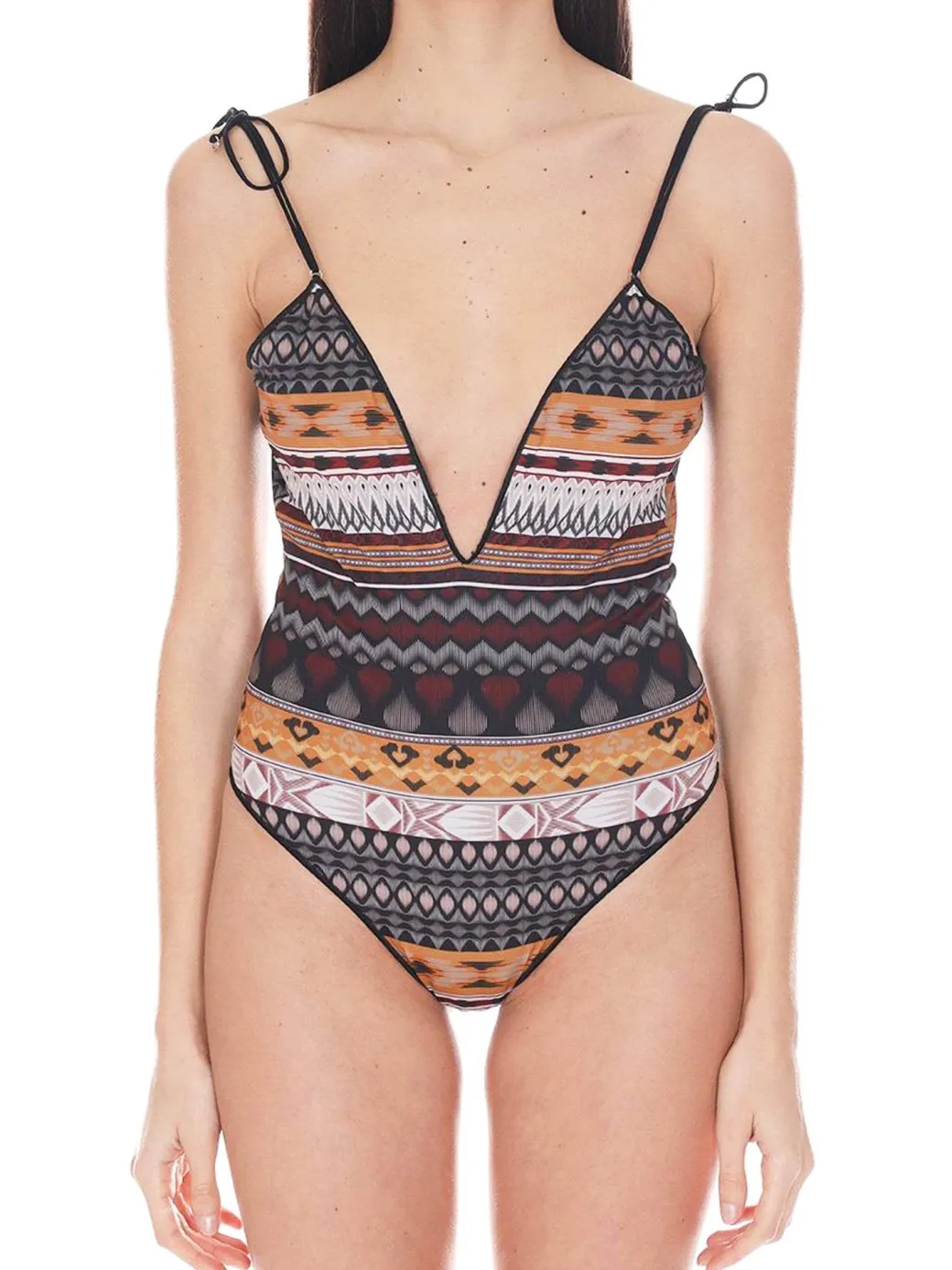 Pronta a viaggiare con i colori? Questa stampa ti porta verso terre calde e lontane e tu non dovrai fare altro che indossare questo monokini Me fui per avere tutto questo con te! Tanti colori, profonfo scollo a v e bretelle regolabili da annodare sulle spalle: tutto brio e femminilità!