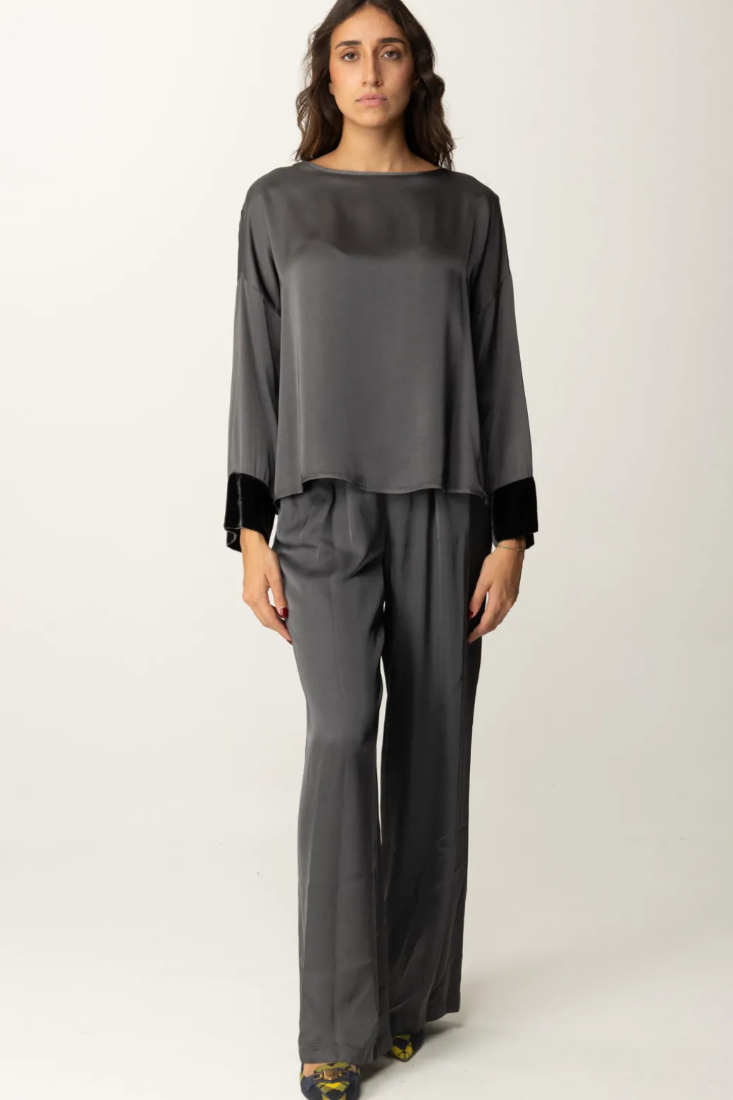 Questa blusa Meme Road dal taglio over è ideale per un look casual ma sofisticato. I dettagli in velluto sui polsini donano un tocco di classe che la rende perfetta per un look da sera, ma puoi anche abbinarla a un paio di jeans mom-fit per un effetto più rilassato.