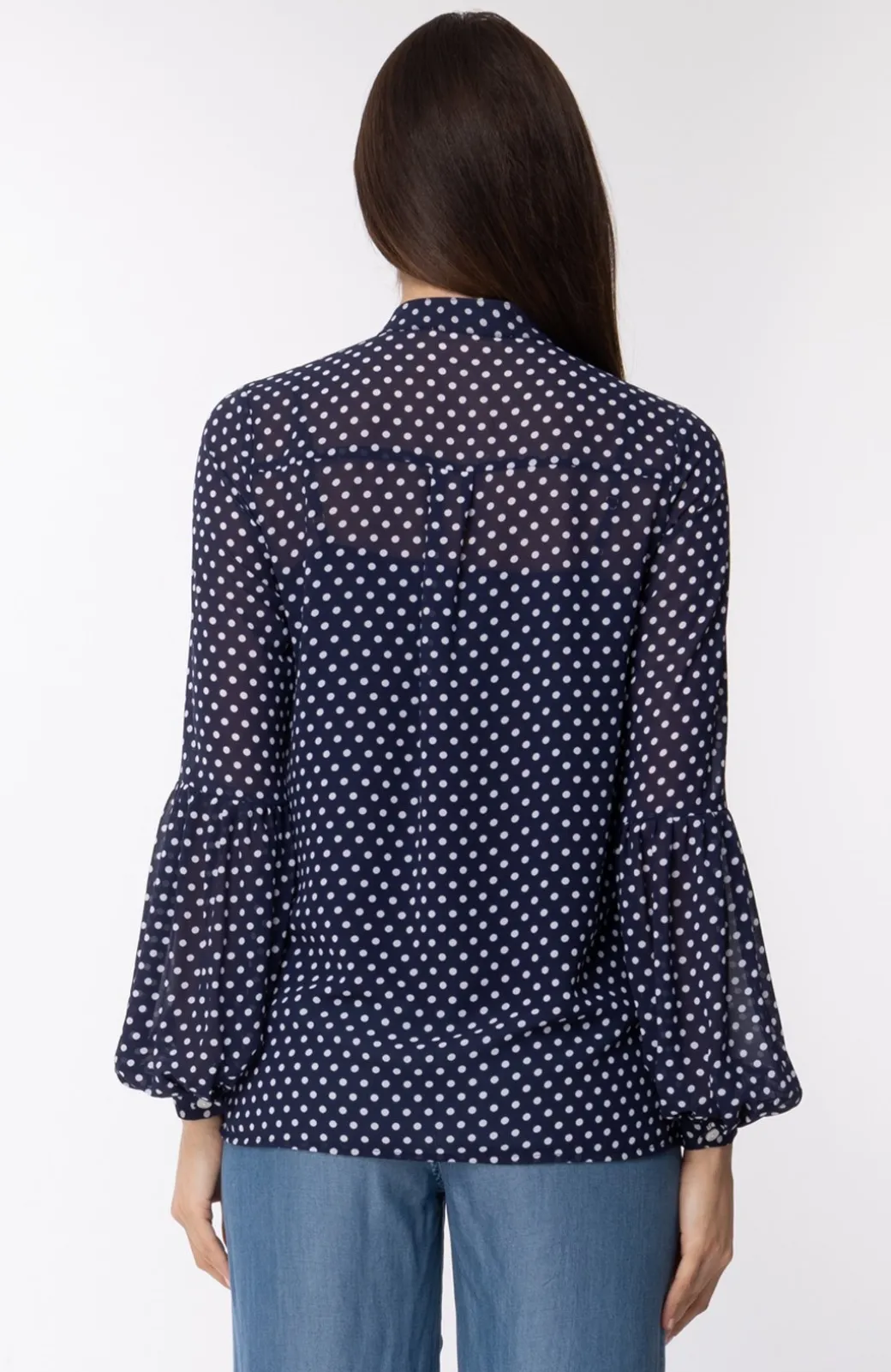 Camicia Micheal Kors leggera e dal design originale, grazie non solo ai pois bianche che la ricoprono interamente ma anche alla plissettatura sul fronte che affianca l’abbottonatura. Le maniche lunghe e blusanti sono fermate da un polsino con bottone.
