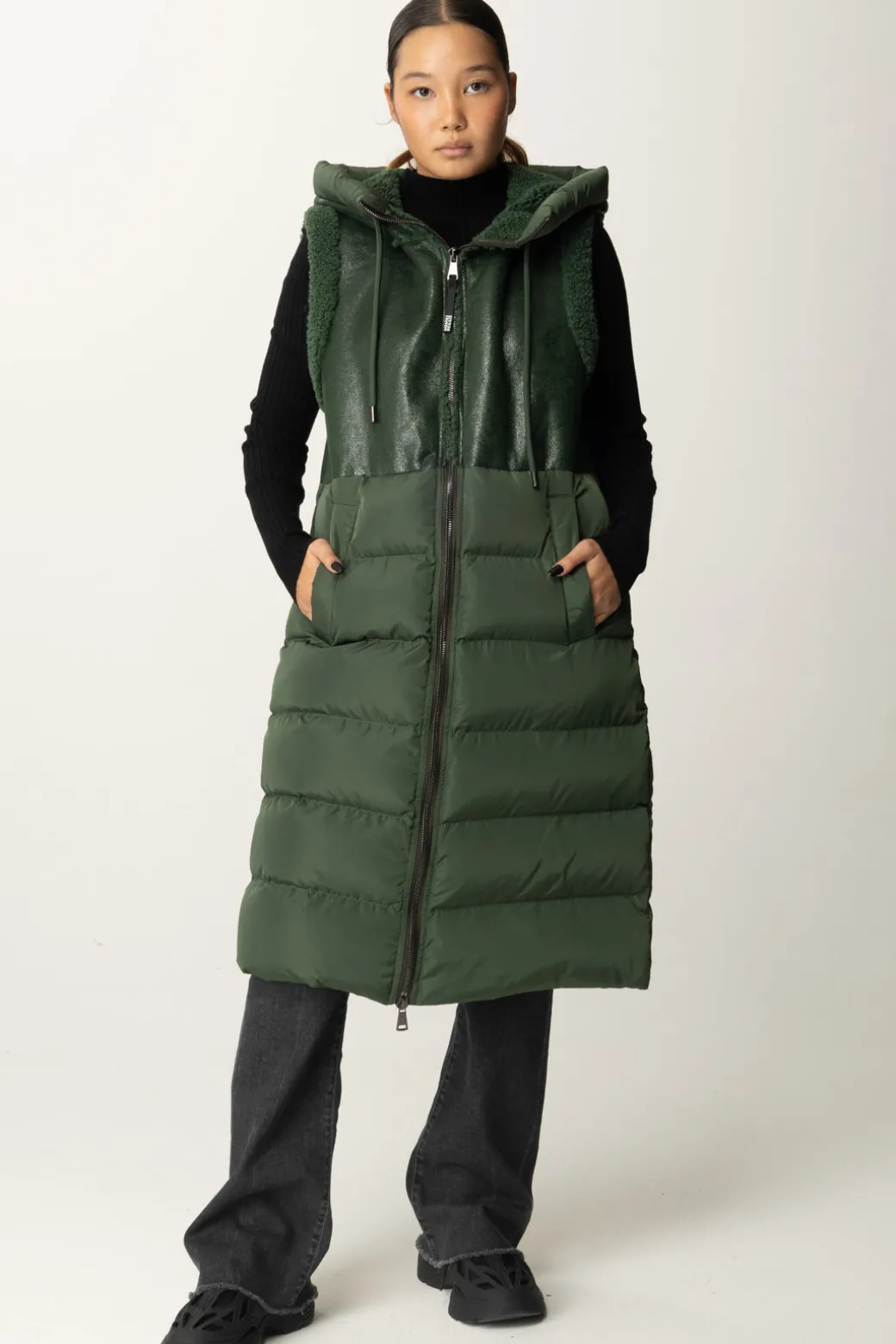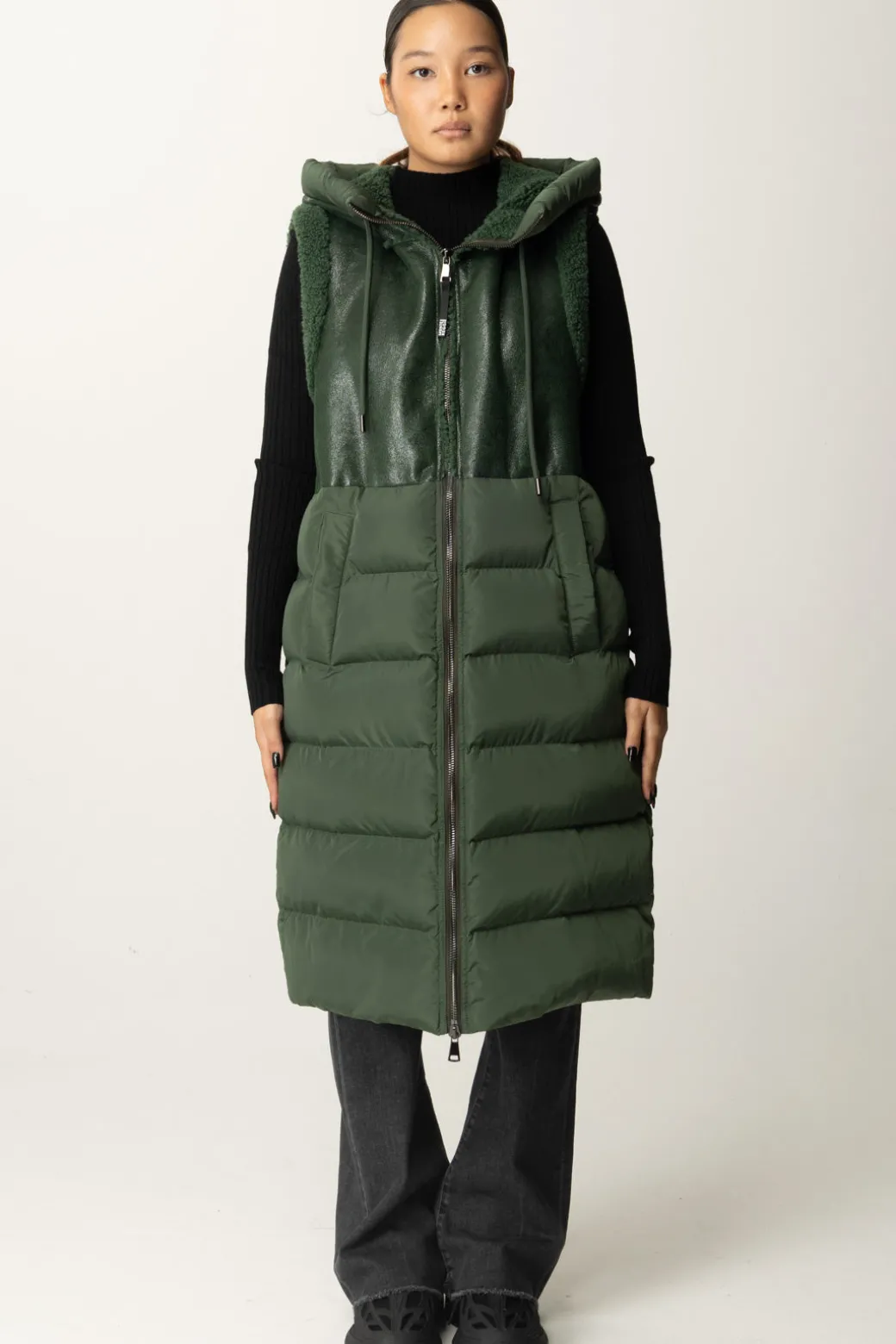 Gilet Montereggi realizzato con un contrasto di tessuti: la parte superiore in pelle leggermente lucida, con effetto smanicato che viene impreziosito da bordi effetto teddy e berretto in poliestere imbottito che richiama la parte inferiore che appare voluminosa e confortevole. L’unione perfetta tra stile moderno e stile sportivo
