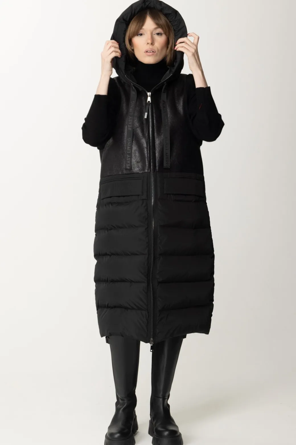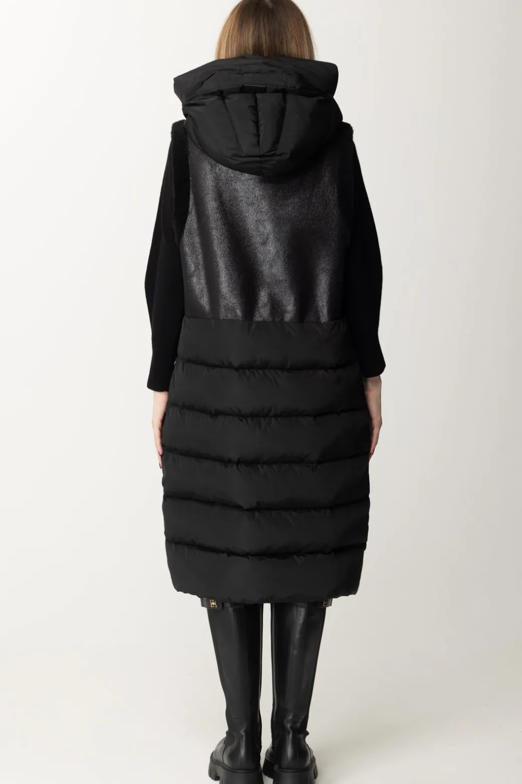 Gilet firmato Montereggi realizzato con un contrasto di tessuti: la parte superiore in pelle leggermente lucida, con effetto smanicato che viene impreziosito da bordi in velluto e berretto in poliestere imbottito che richiama la parte inferiore che appare voluminosa e confortevole. L’unione perfetta tra stile moderno e stile sportivo.