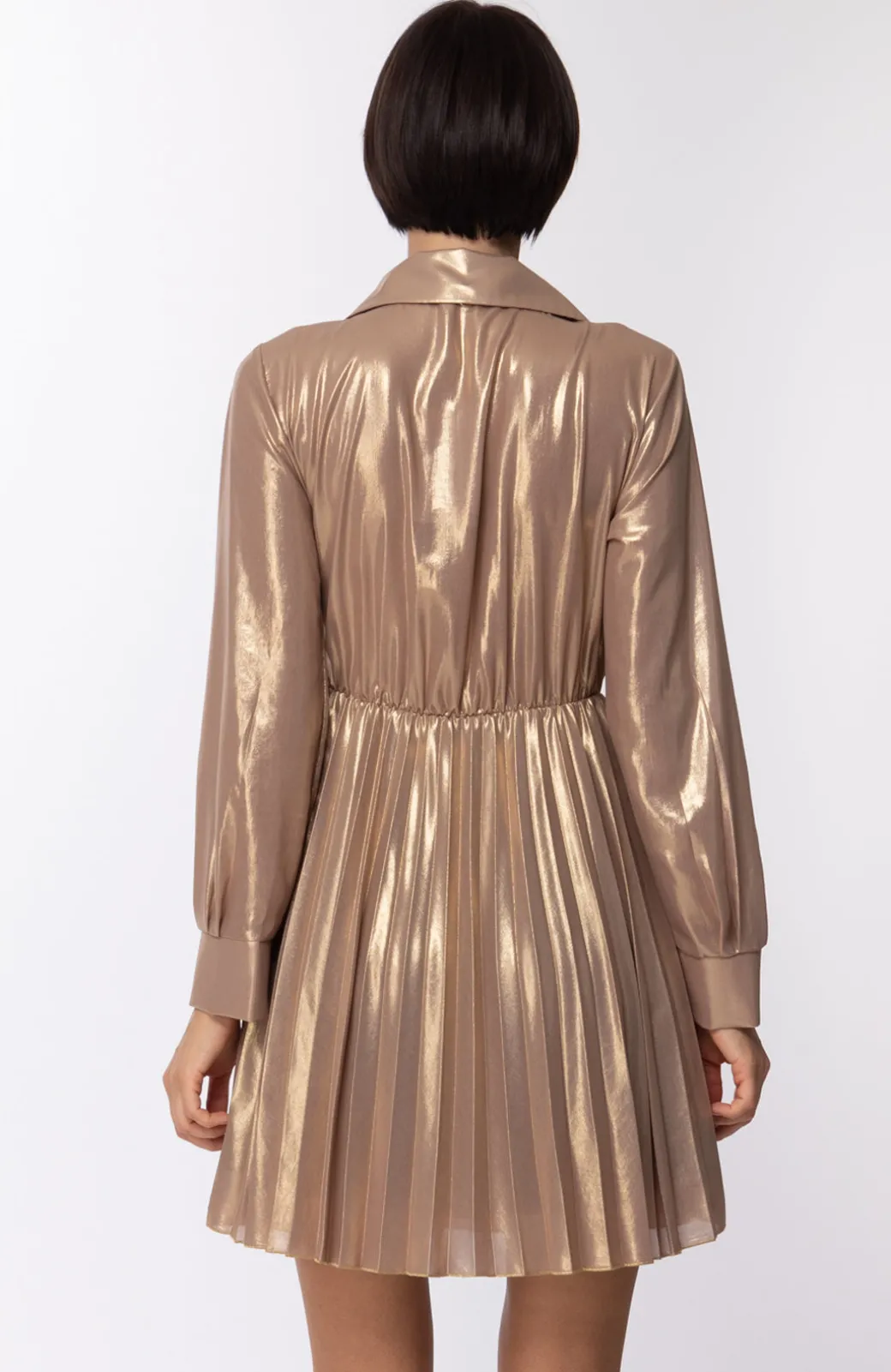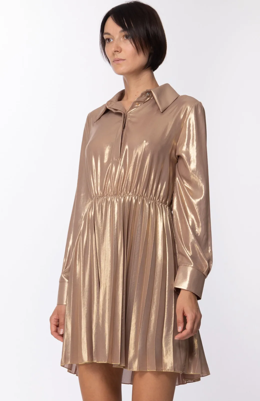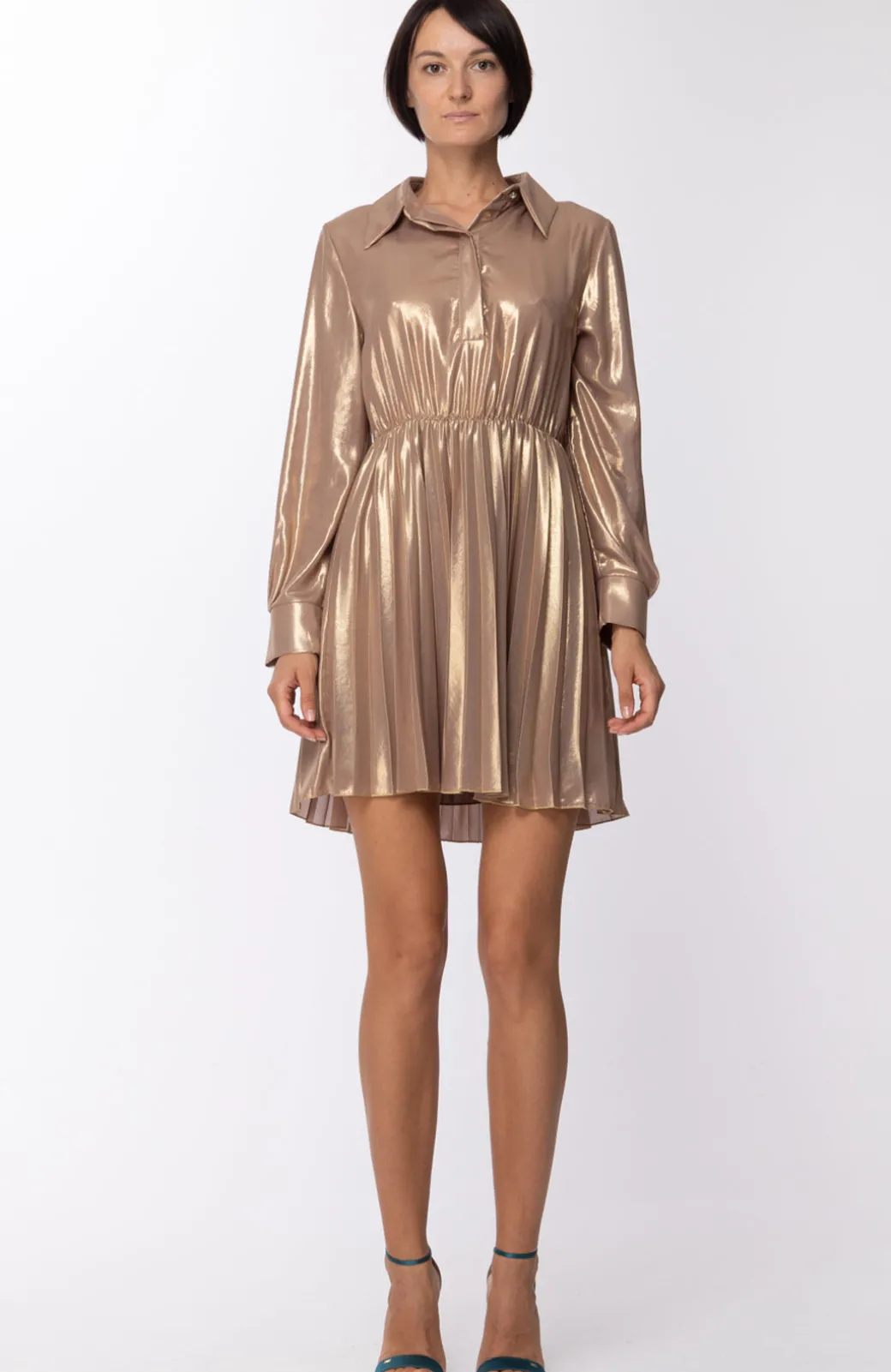 L’effetto laminato è soltanto uno dei dettagli che aggiunge un twist unico a questo mini abito Motel: divertente e femminile, la gonna plissettata si incontra con un top con colletto e maniche lunghe, mentre il punto vita è marcato da una cintura trasparente con fibbia in metallo. Una proposta ideale per il giorno così come per il tempo libero, che da il meglio di sè con i tacchi alti.