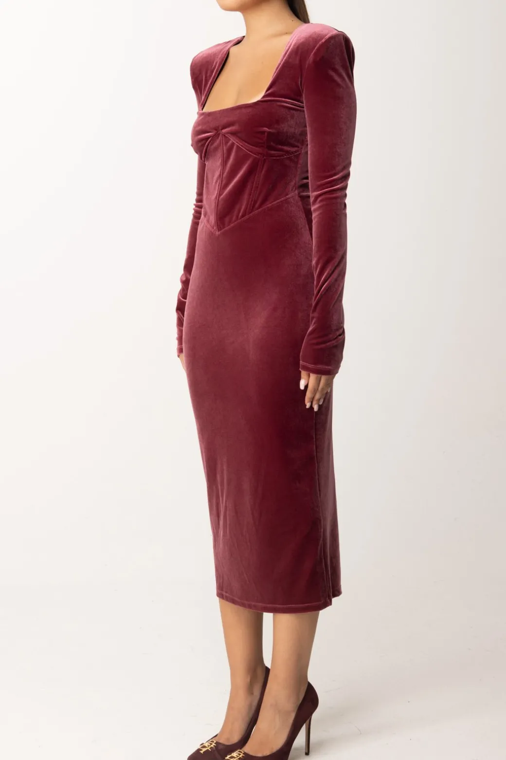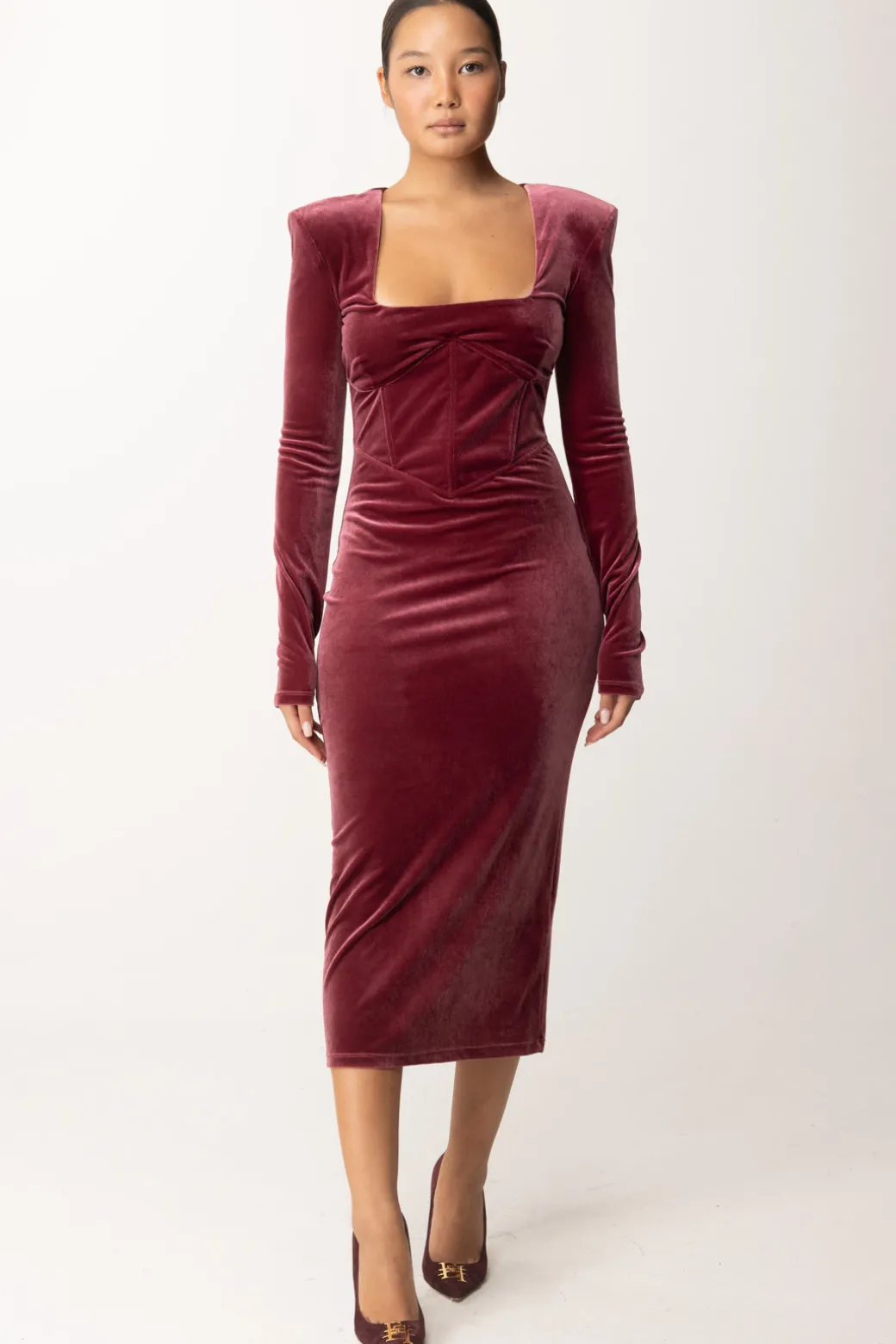 Questo abito Patrizia Pepe dal modello midi, è realizzato in elegante velluto, per un perfetto fascino di eleganza adatto alla stagione fredda. Le spalle strutturate e la scollatura squadrata donano una silhouette slanciata e moderna, il che lo rende ideale per una serata speciale, abbinalo con tacchi alti e gioielli minimal per un look sofisticato e senza tempo.
