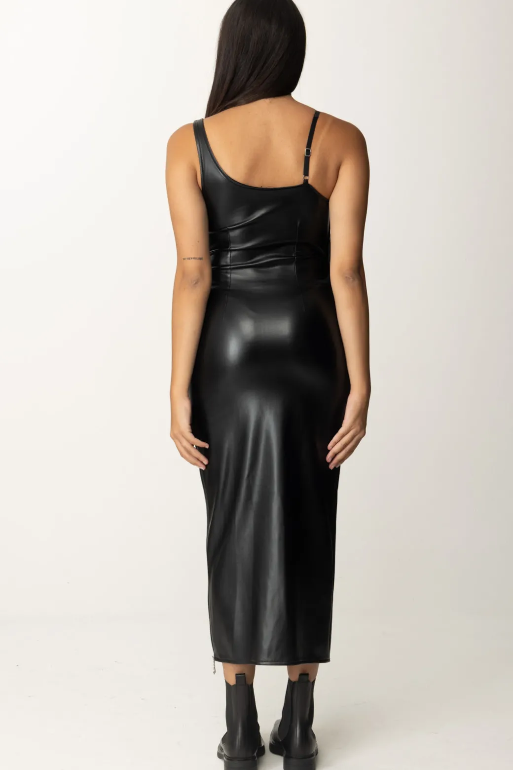 Questo abito midi Patrizia Pepe in ecopelle è un mix di grinta e sensualità. Caratterizzato da una spallina sottile e una più spessa, in quella più sottile la parte del seno presenta l’iconico logo Fly e una serie di eyelettes. Lungo la gonna è presente uno spacco laterale regolabile che con zip argentata e il logo fly che aggiungono un tocco contemporaneo. Perfetto con sandali alti per un look serale audace.