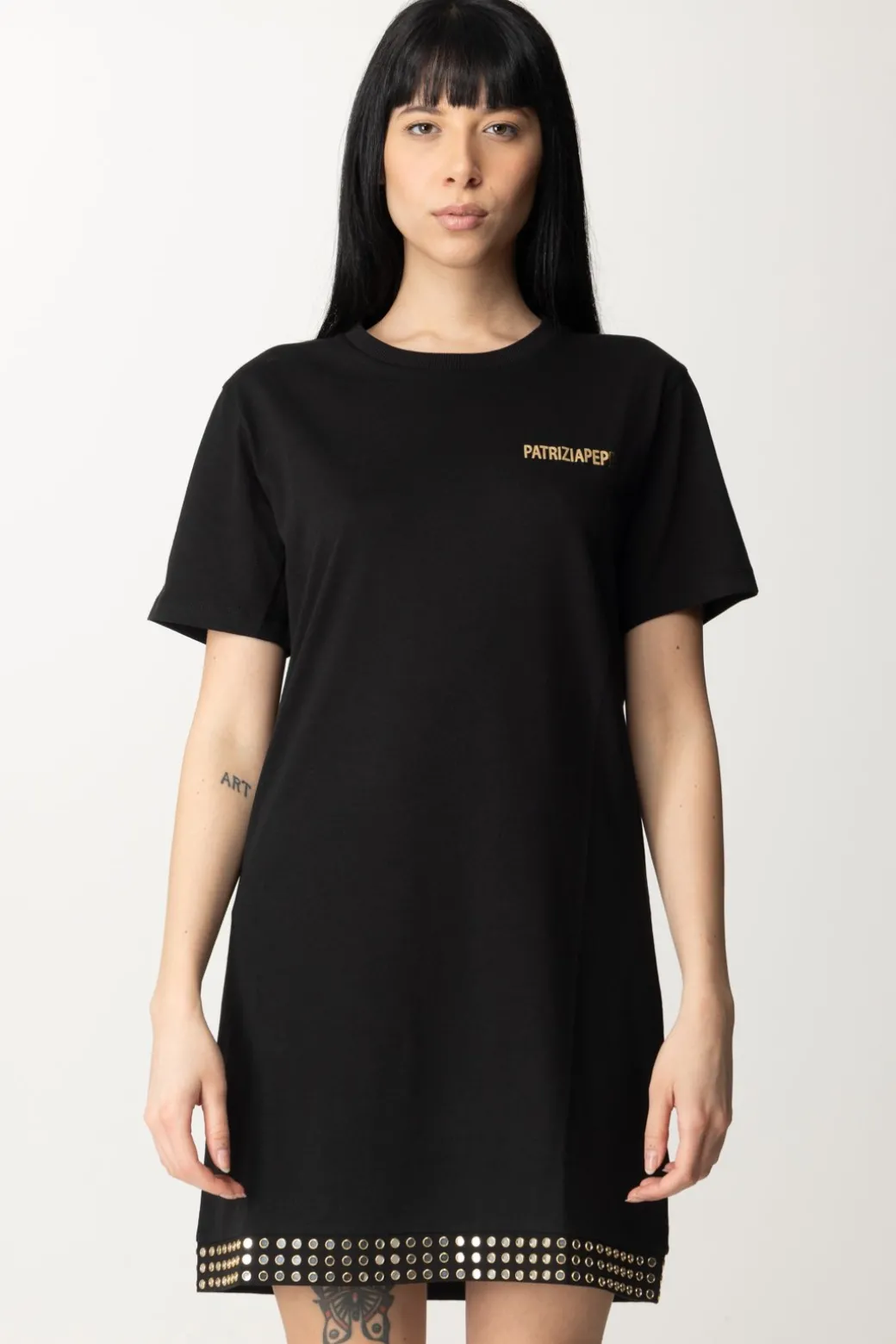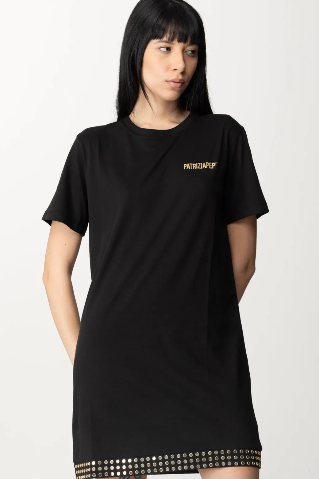 Esplora l’eleganza moderna con questo abito Patrizia Pepe realizzato con un tessuto sottile ed elastico, che avvolge il corpo con grazia e comfort. Il design presenta un tocco di audacia con logo laminato posizionato con classe sulla spalla e le borchie che adornano con stile il fondo della gonna, creando un equilibrio perfetto tra sofisticazione e modernità.