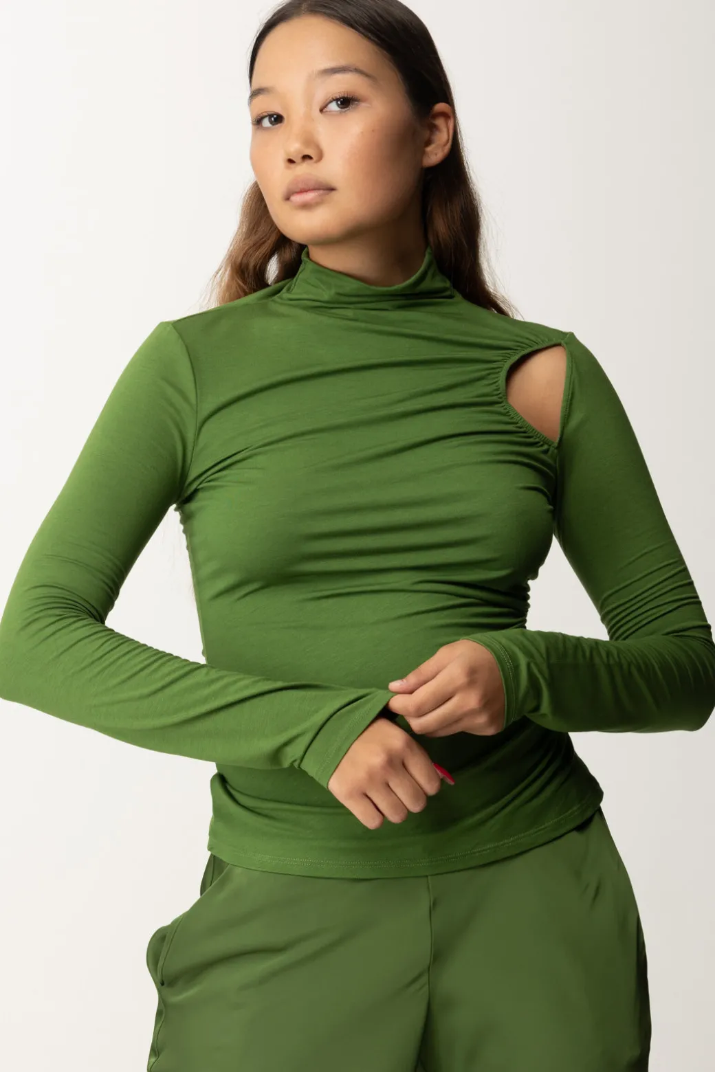 Questa maglia dolcevita Patrizia Pepe è realizzata in jersey stretch e una linea slim che abbraccia la figura con eleganza. Il dettaglio cut-out sulla spalla aggiunge un tocco contemporaneo e audace, rendendo questo capo perfetto per chi cerca uno stile minimal ma d’effetto.