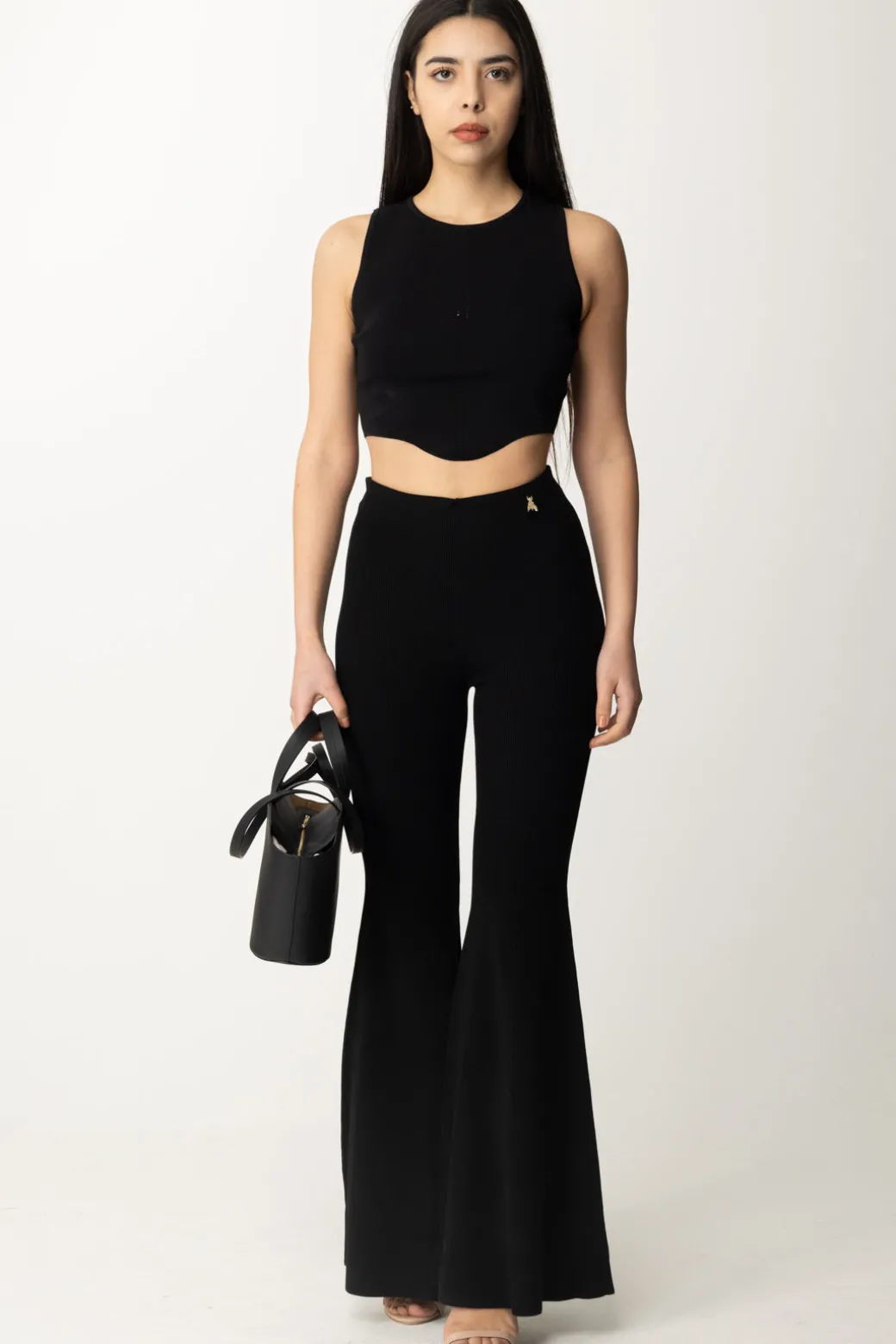 Pantaloni flare Patrizia Pepe realizzati in maglia a costine epr cnoiugare bellezza e praticià in un unico imperdibile capo. La svasatura della gamba sarà bellissima indossata con il giusto paio di tacchi che la dispieghi in tutta la sua ampiezza, mentre il resto della gamba aderisce perfettamente alle tue forme, come una seconda pelle: provare per credere!