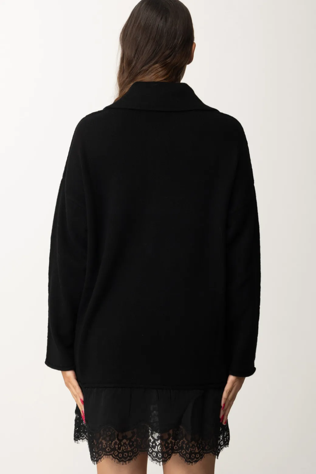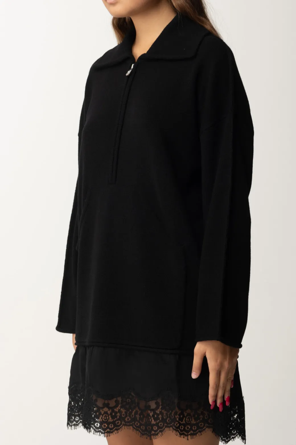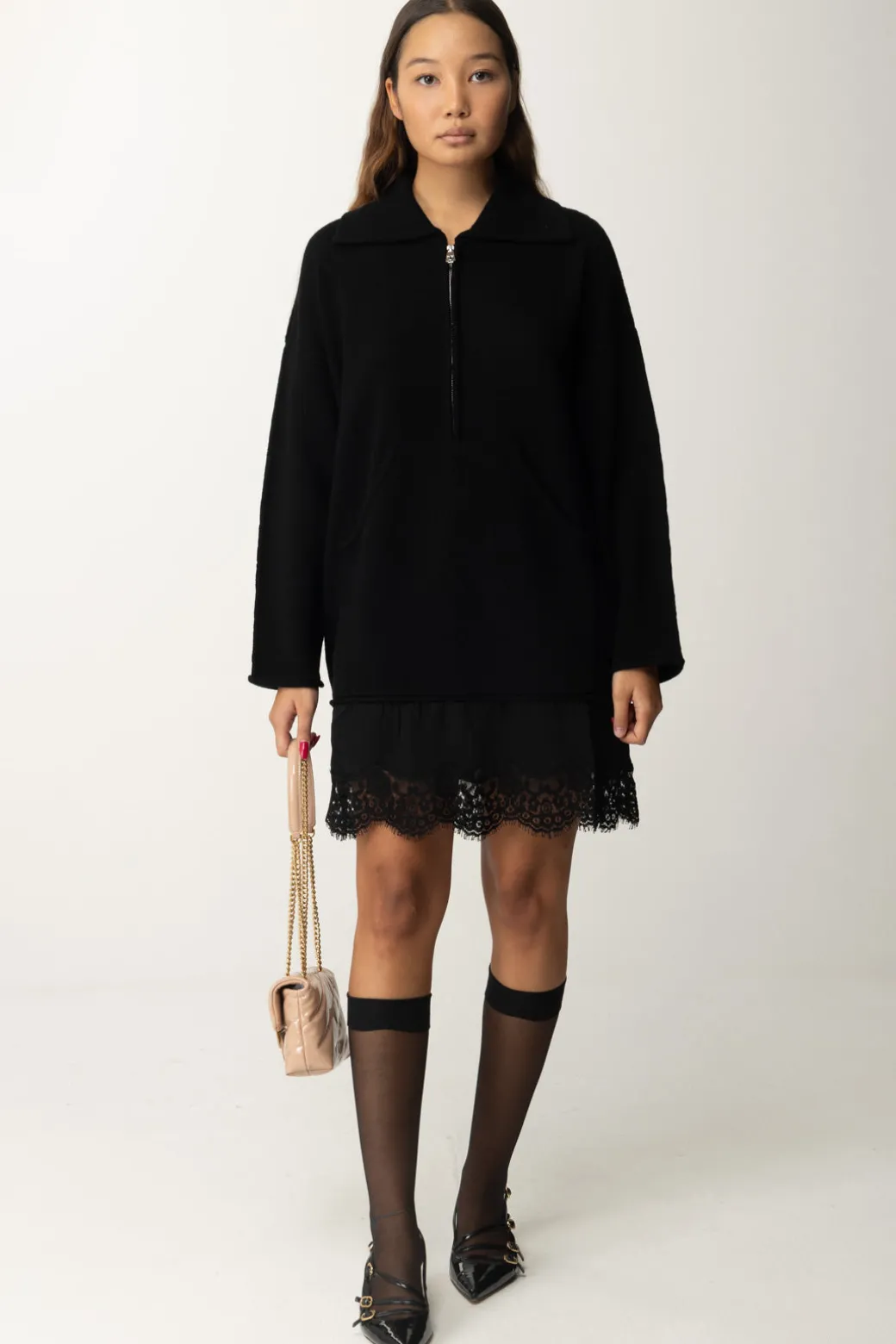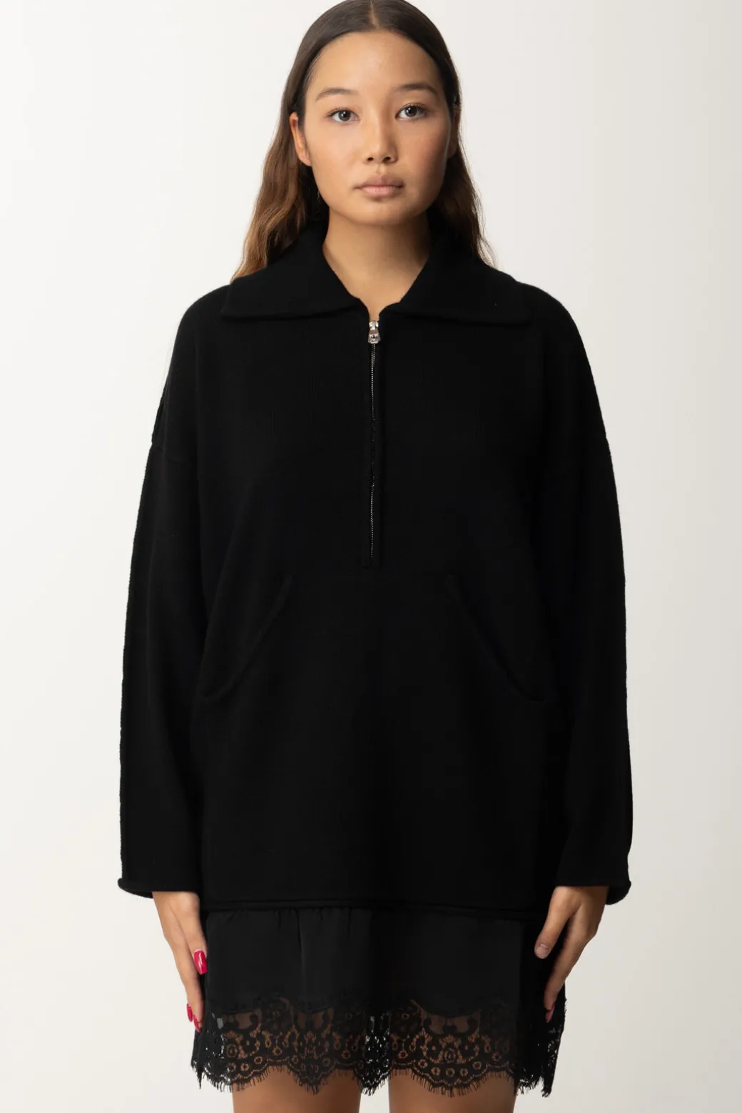Abito Pinko realizzato con un pregiato mix di cashmere e lana che si distingue per il design a più strati e i raffinati dettagli in pizzo sul fondo. Il colletto alla francese e le maniche rilassate con spalle scese conferiscono un mood casual-elegante al tempo stesso, mentre la tasca frontale a marsupio e la zip regolabile per il colletto aggiungono un tocco funzionale. Indossalo con stivaletti alla caviglia per un look casual chic, o con collant e décolleté per una serata elegante.