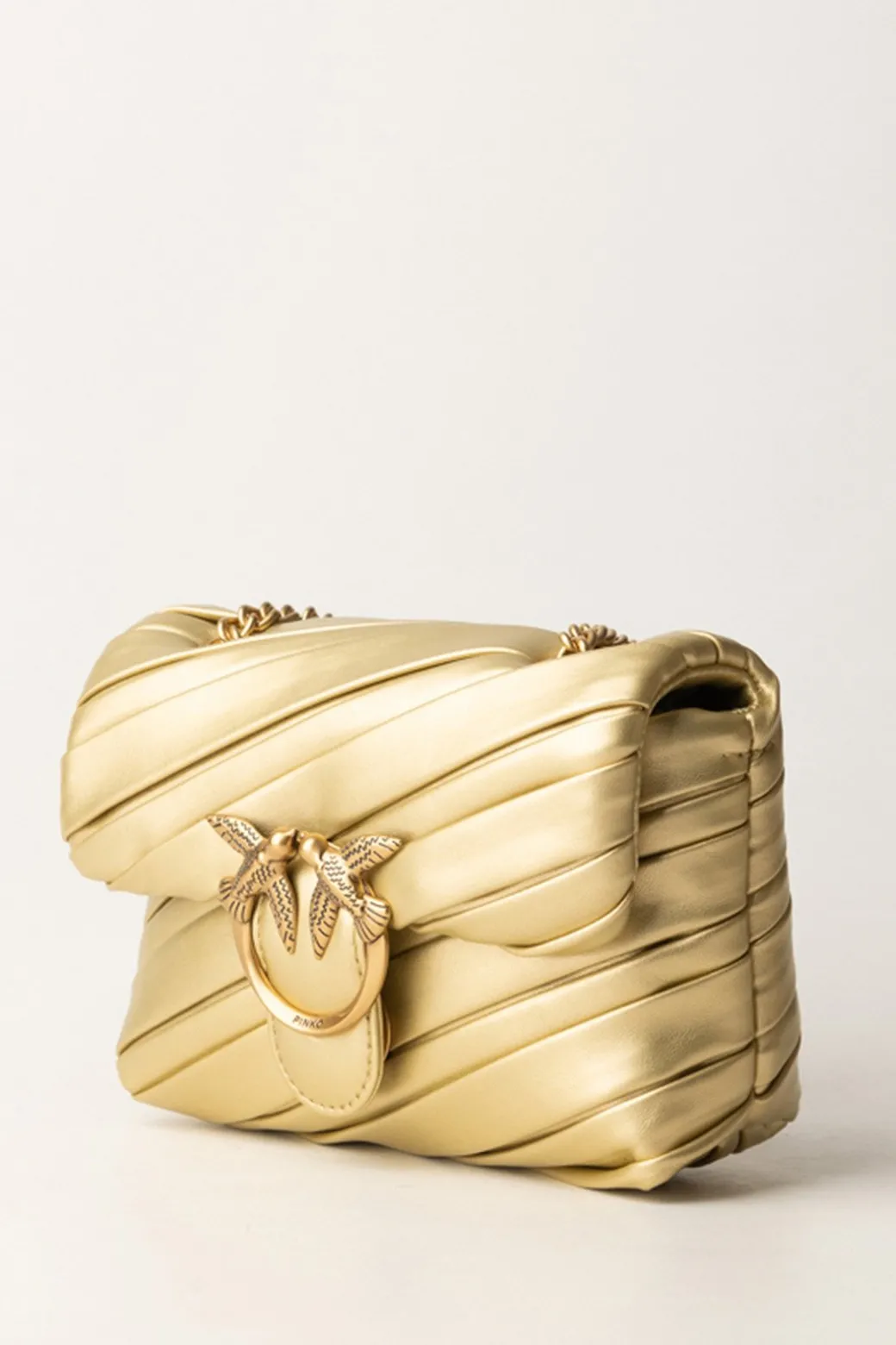 Illumina un outfit color block e rendi luxury i tuoi outfit da sera con una borsa a tracolla Pinko Baby love puff in oro, completata da tracolla a catena con spallaccio in pelle tono su tono e fibbia con logo Love birds e lettering in metallo. Lo stile del brand in un accessorio piccolo ma d’impatto, adatto anche ad outfit formali e da evento importante.