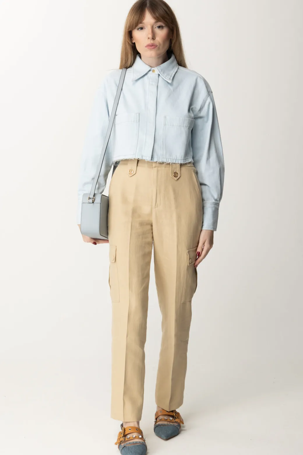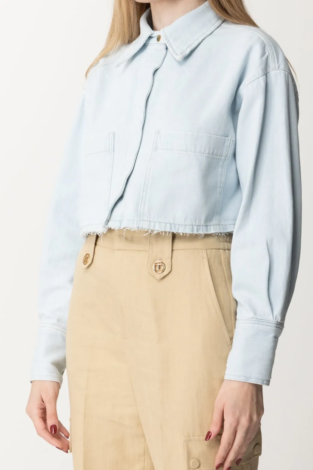 Bellissima da sola, bellissima come capo crop da indossare sopra un top basico o colorato: valuta ogni possbilità d’suo di questa camicia Pinko in denim leggero con lavaggio chiaro, con tasche al petto e taglio a vivo. Lunghezza crop, un top divertente e trendy, che porta la primavera nel suo design.