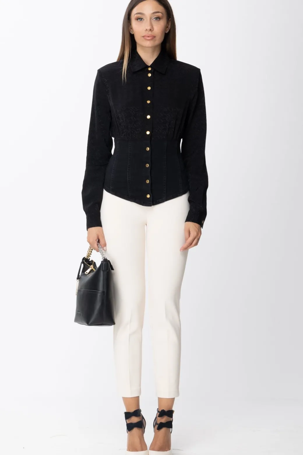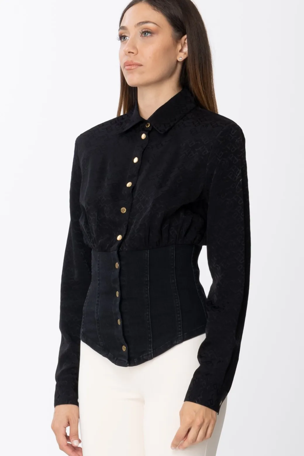 La camicia è uno dei capi must- have di ogni stagione, e questo originale modello Pinko non può mancare nel tuo guardaroba invernale!Parte superiore e maniche lunghe realizzate in jacquard logato, parte inferiore attillata per definire la silhouette a mo di corpetto in denim black stretch e abbottonatura con bottoncini in metallo dorato. Il capo ideale da abbinare a tuo piacimento ai più svariati outfit, grazie alla suo design particolare e versatile!