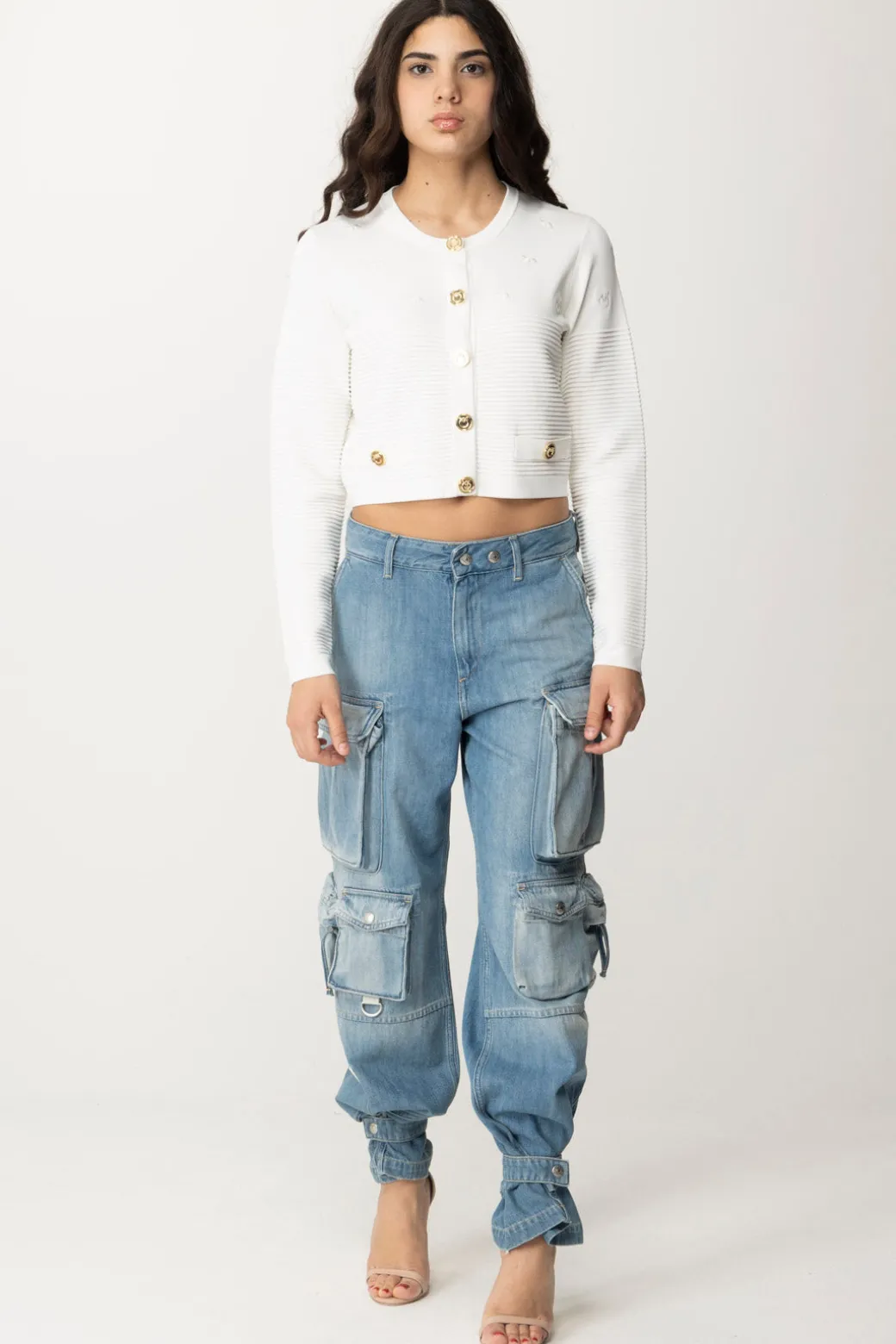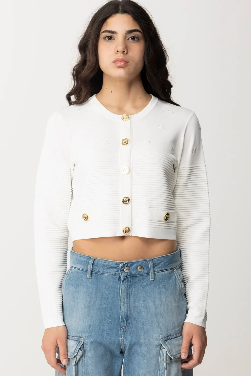Cardigan Pinko arricchito da bottoni e ricami logati, ideale per aggiungere un tocco di eleganza e raffinatezza ai tuoi outfit primaverili.