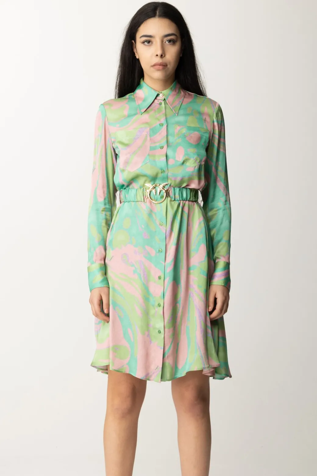 Leggero come una carezza sualla tua silhouette: effetto satin e stampa delicata e multicolor per questo abito chemisier Pinko, sagomato al punt ovita da uan cintra in tinta con fibbia logo Love birds. Bellissimo da indossare per eventi diurni, dove spiccare per eleganza, abbianato ad una delle tantissime Love bag della stagione.