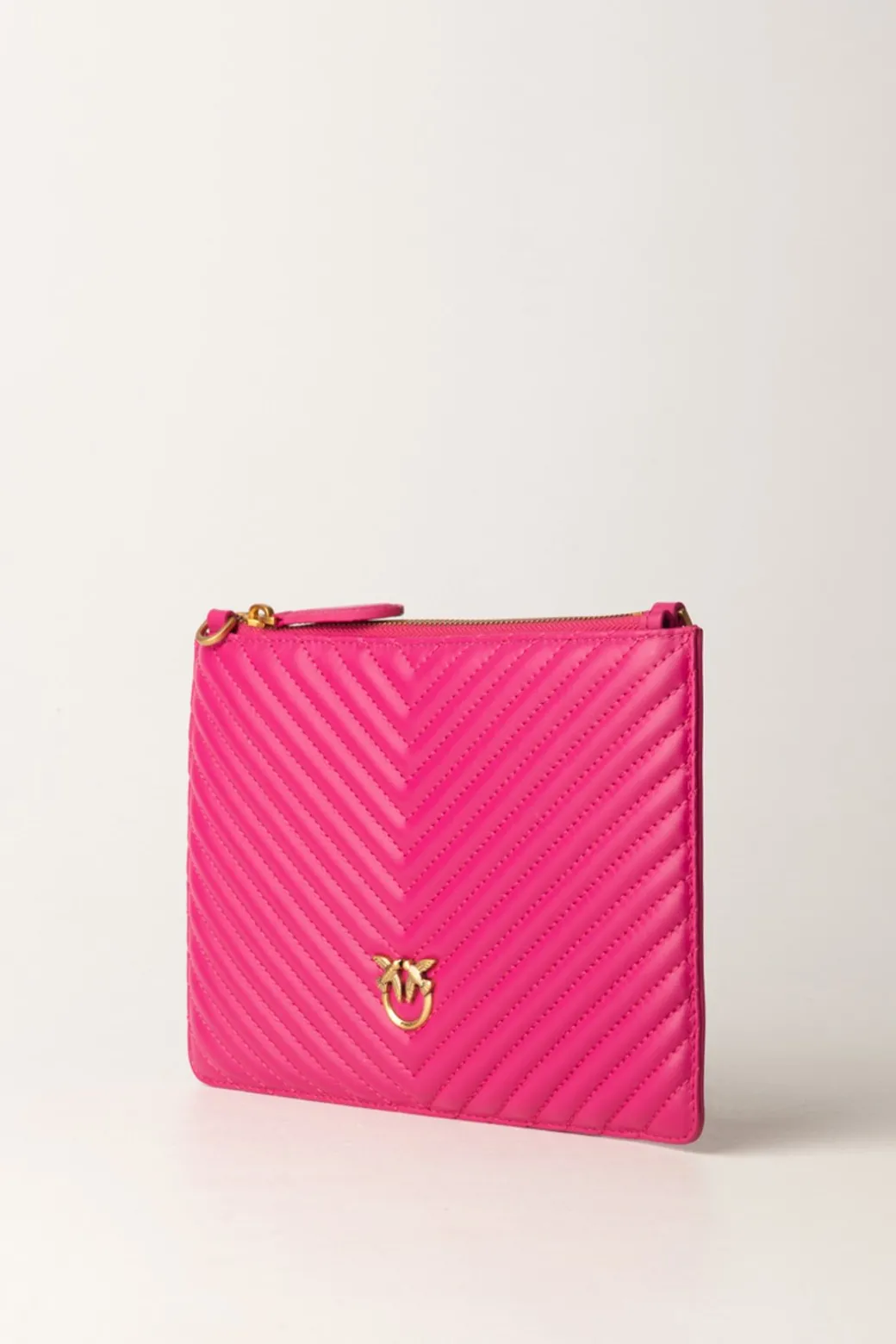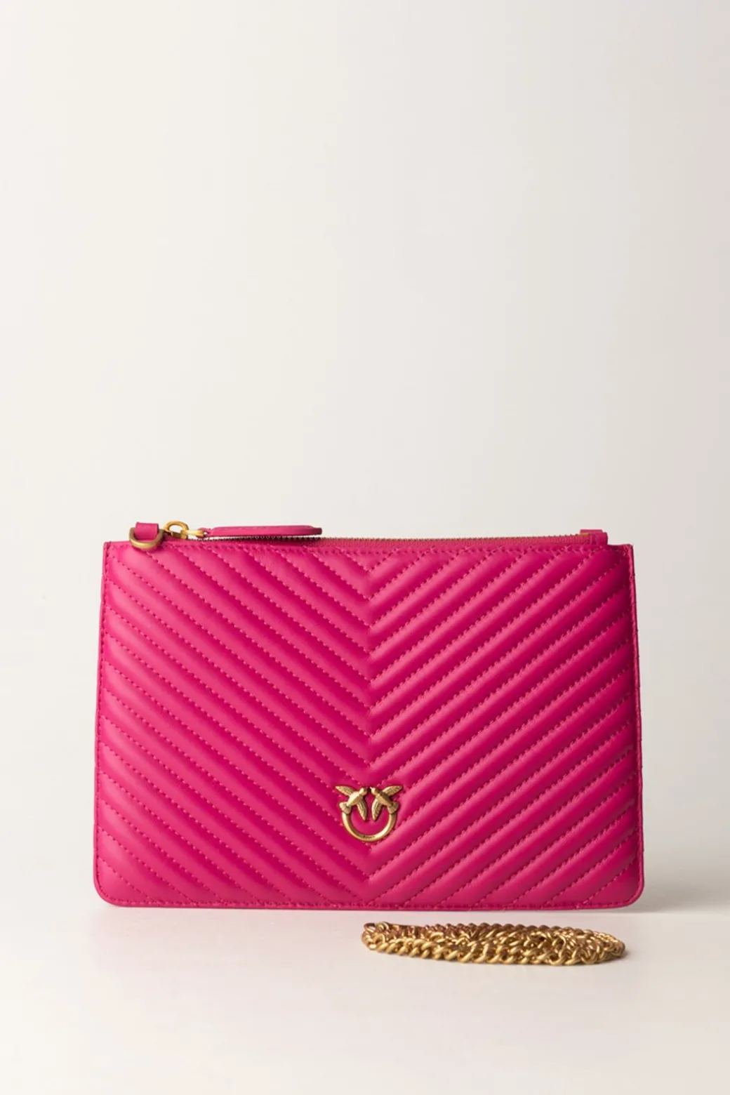 Un piccolo logo Love birds per rivelare a quale brand appartiene questo stile minimal e sofisticato, per un accessorio da sera quanto da evento: una pochette Pinko flat, realizzata in pelle e illuminata dalla presenza di una tracolla a catena oro.