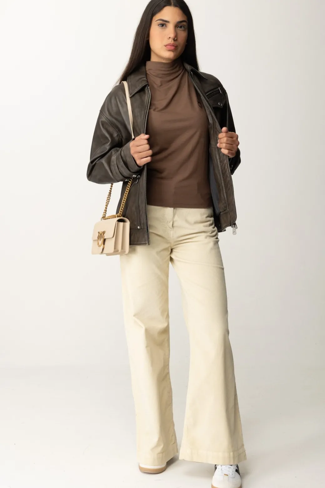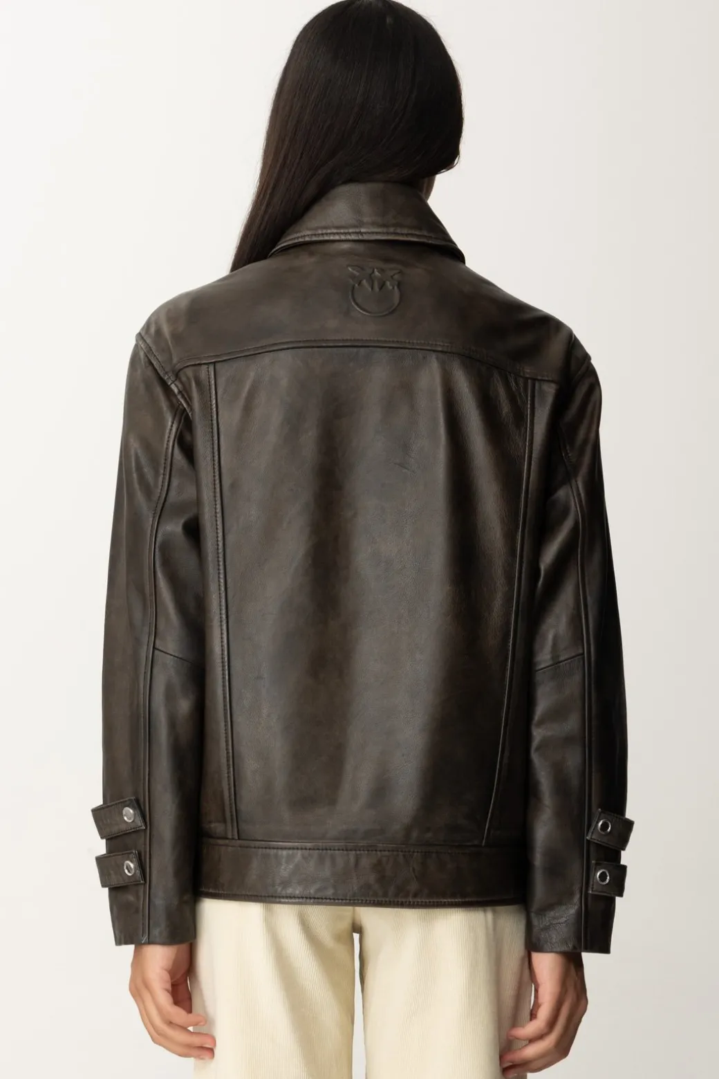 Questo giubbino Pinko in pelle dal taglio over ha un design vintage che combina perfettamente il fascino dello stile retrò con un tocco moderno. I dettagli con zip sul davanti e sopra le tasche, insieme alle doppie cinghie sulle maniche, aggiungono un carattere deciso e distintivo a questo capo unico.