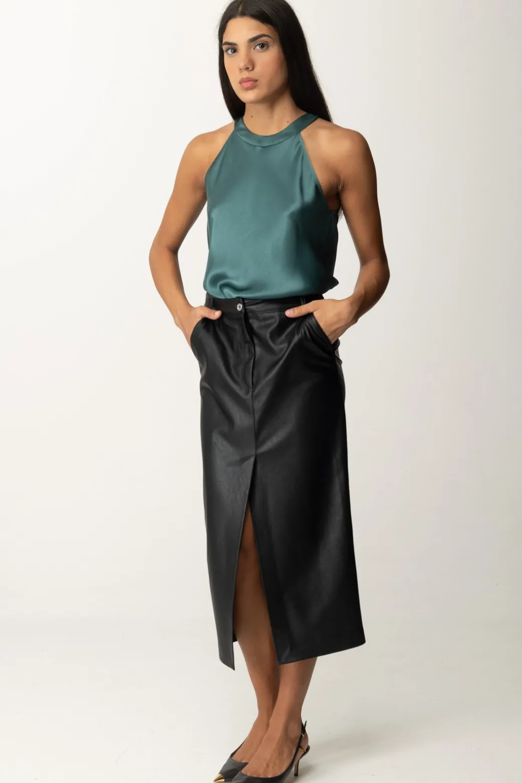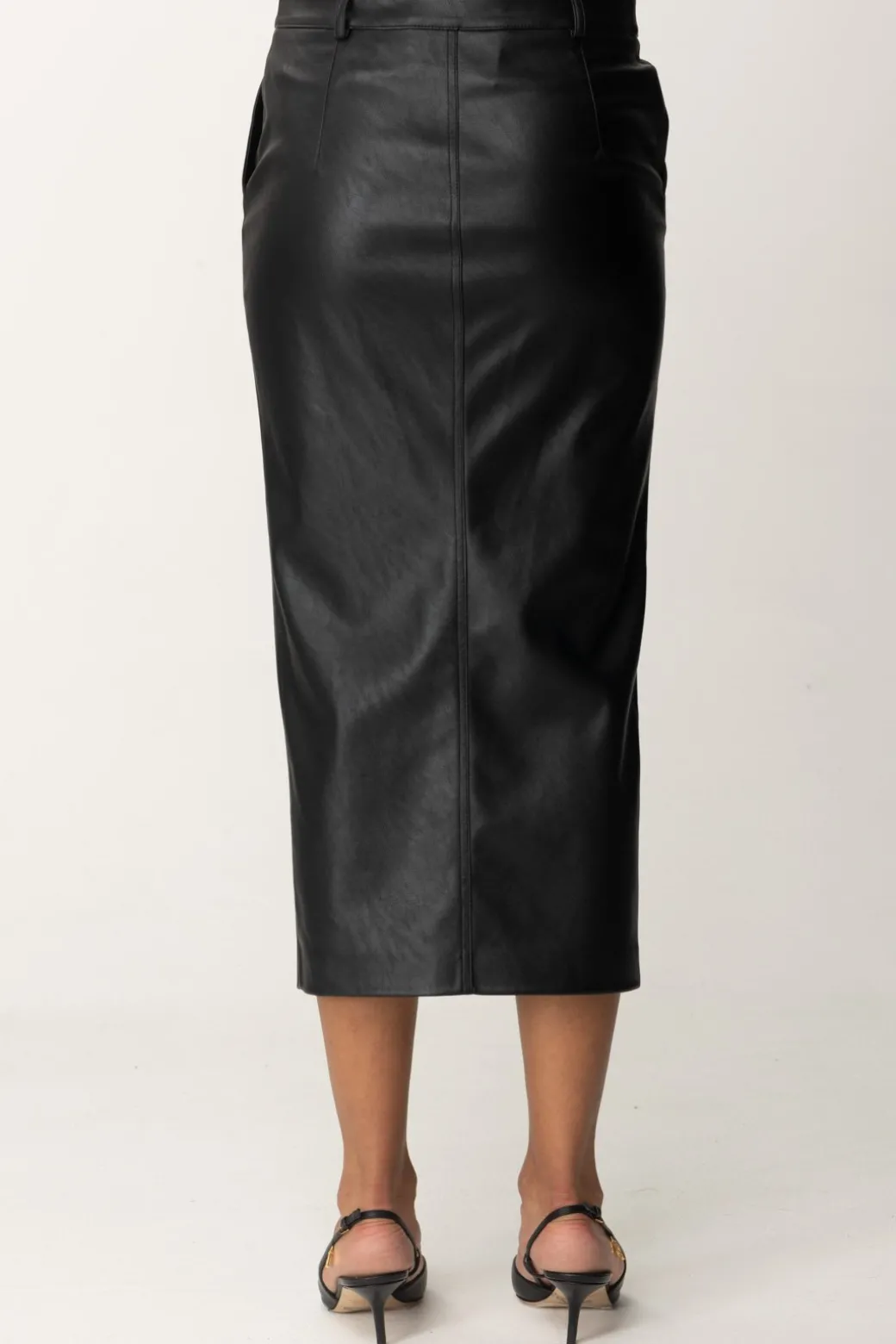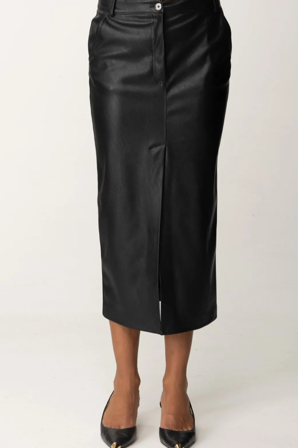 Questa gonna Pinko midi in similpelle con spacco frontale e vita alta è perfetta per aggiungere un tocco di grinta al tuo look. Indossala con una camicia bianca e tacchi alti per un outfit sofisticato, oppure con un maglione oversize e stivaletti per un fascino casual-chic.