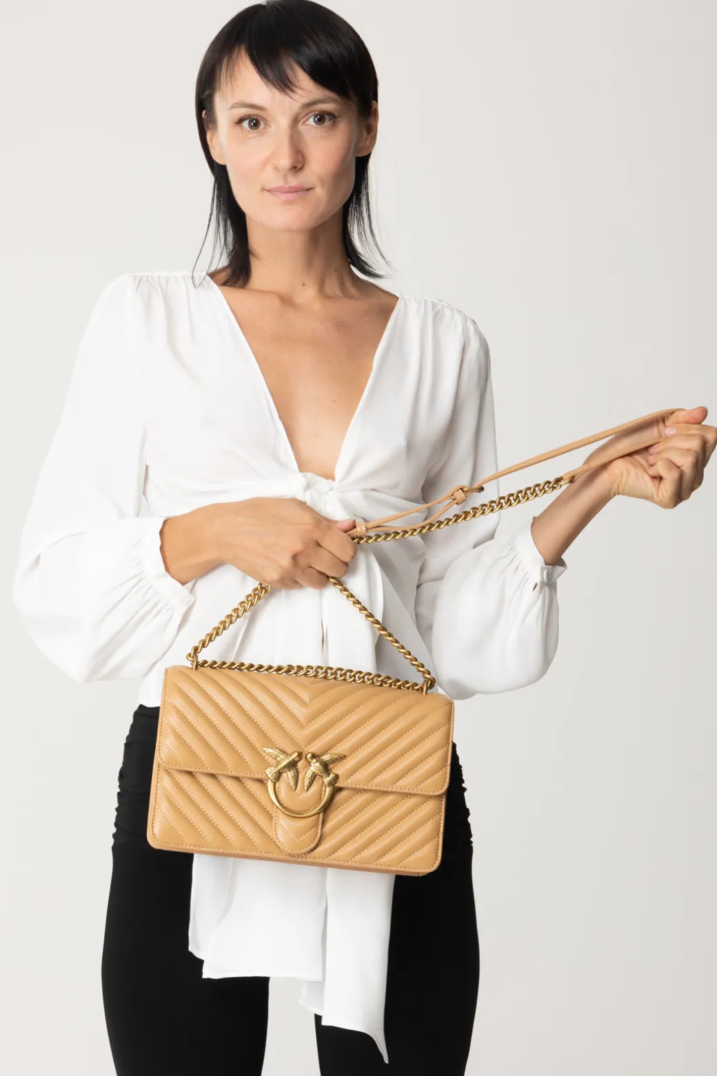 Una borsa Love Bag Pinko la si riconosce a primo impatto! Design squadrato, chiusura con patta impreziosita da cinghia borchiata e logo Love Birds e infine la tracolla a catena con inserto in pelle. Non si ci stanca mai di indossarla!Tasca interna