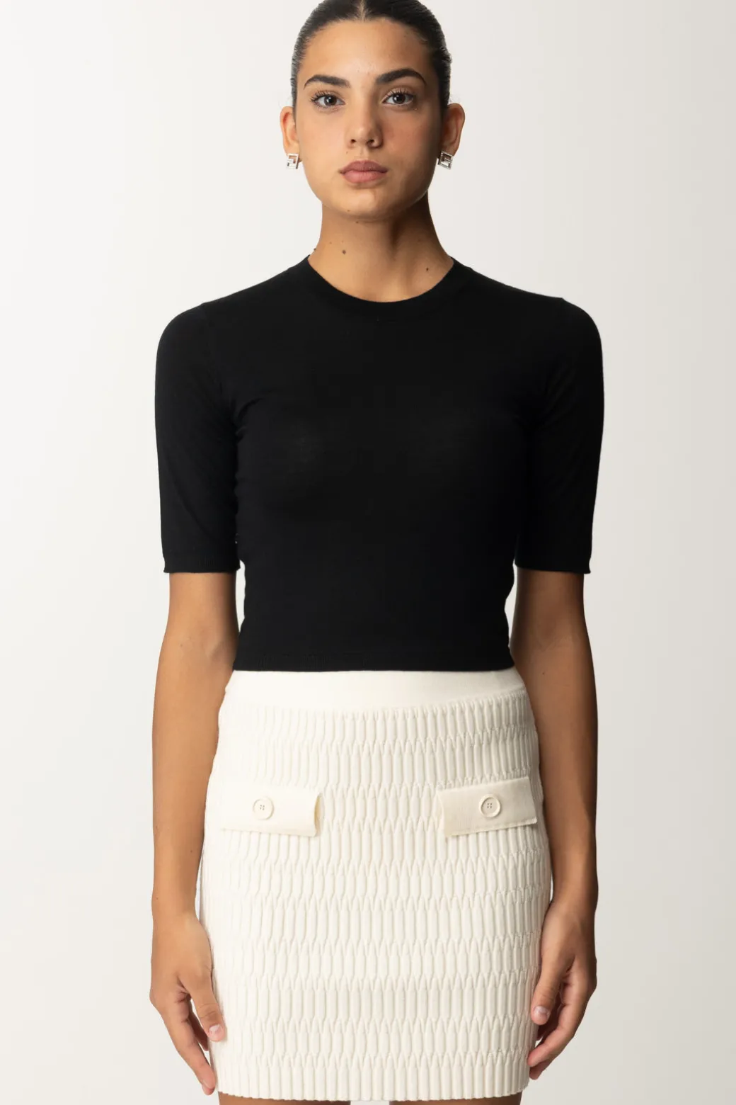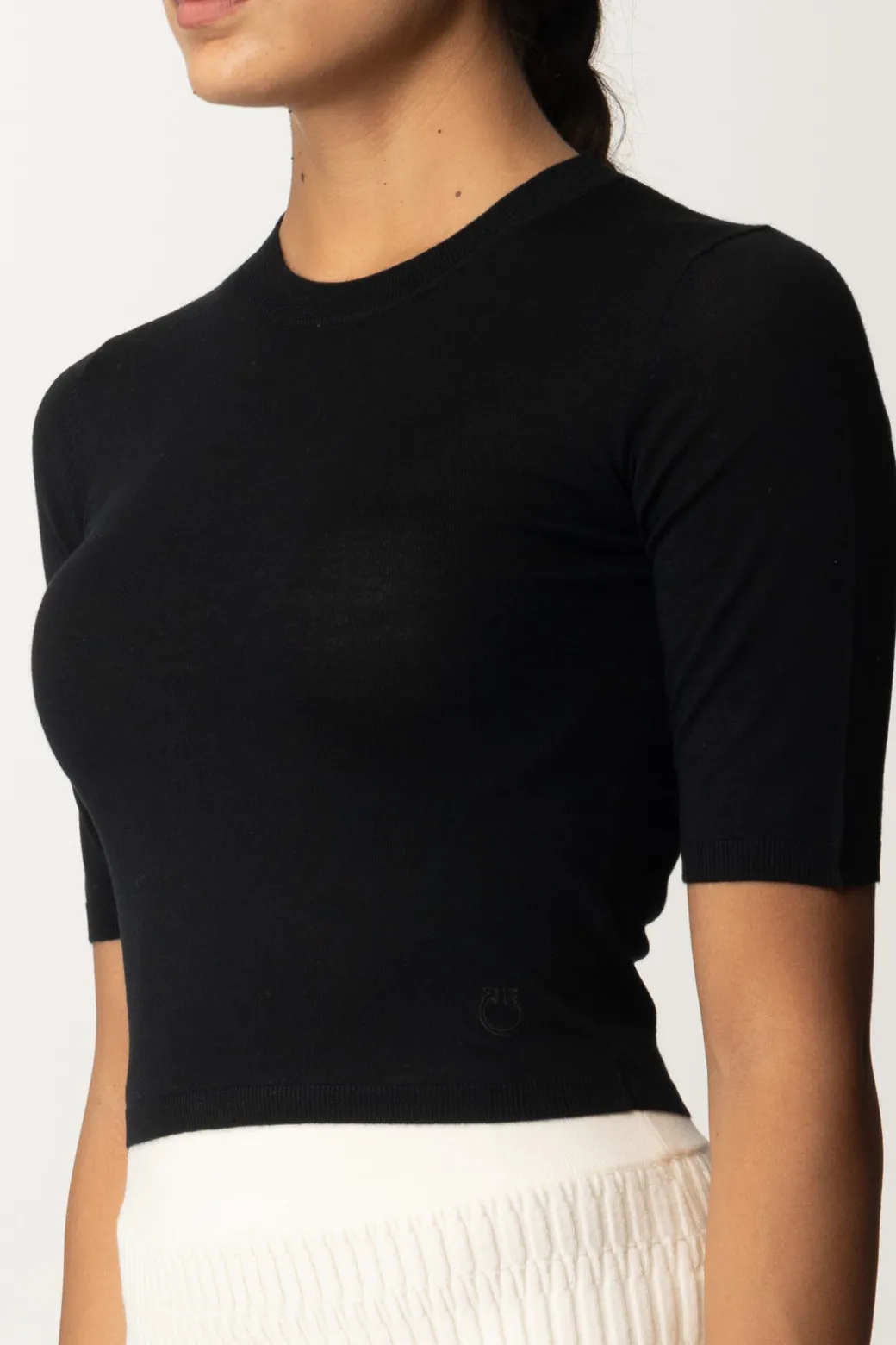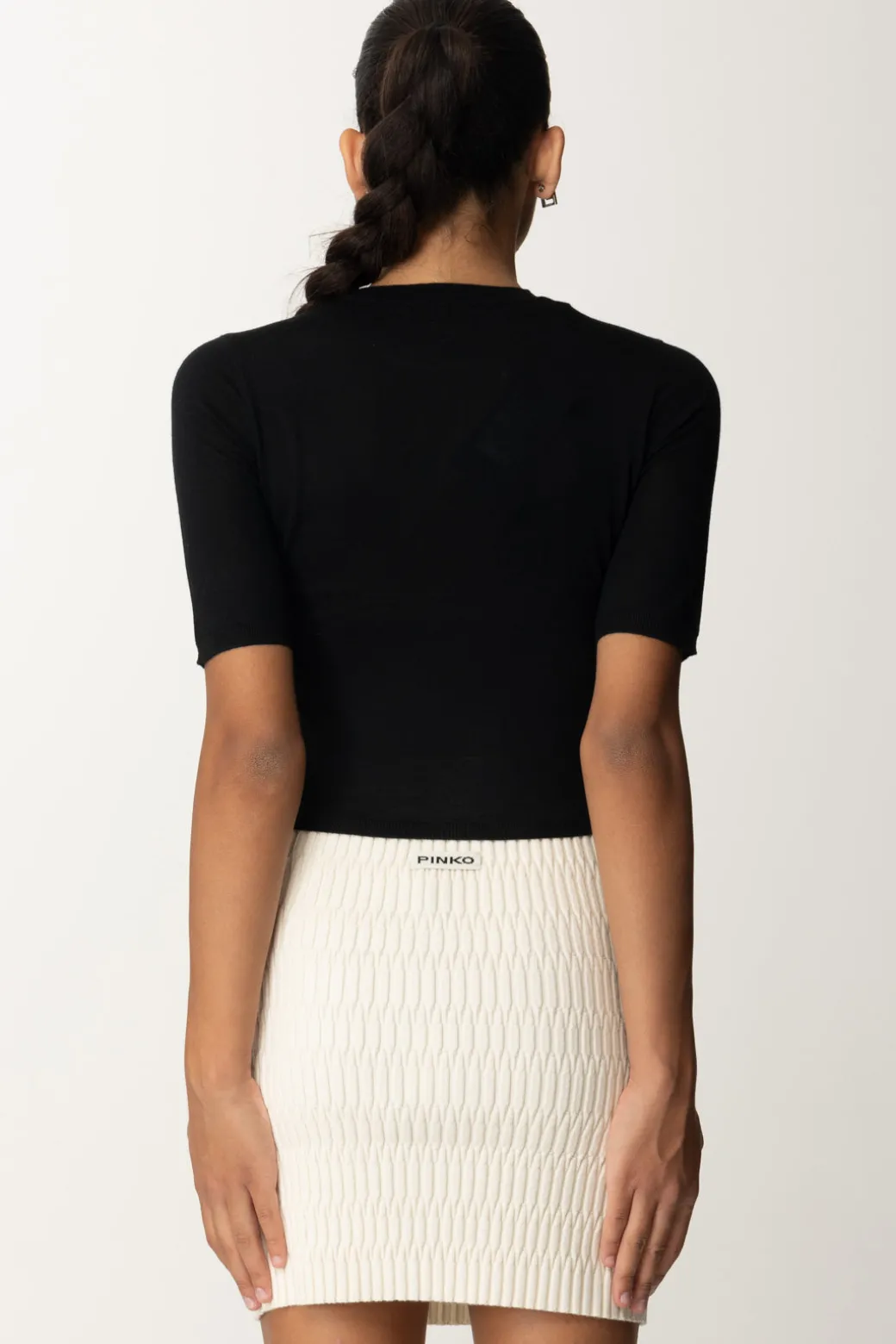Maglia Pinko corta, dal fit aderente e mezze maniche, perfetta per un look giovane e fresco. Abbinala a una gonna a vita alta e sneakers per un look casual e trendy.