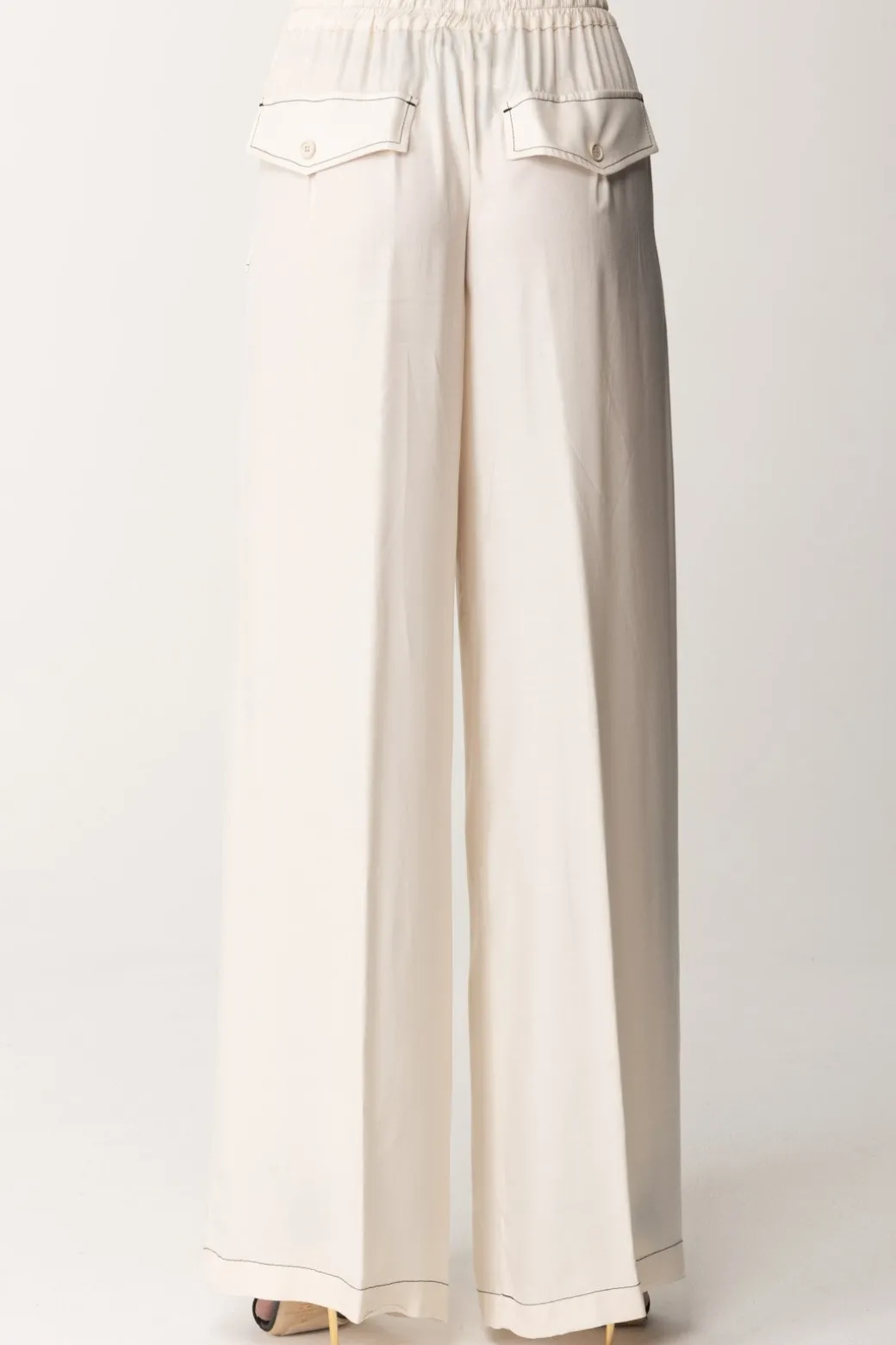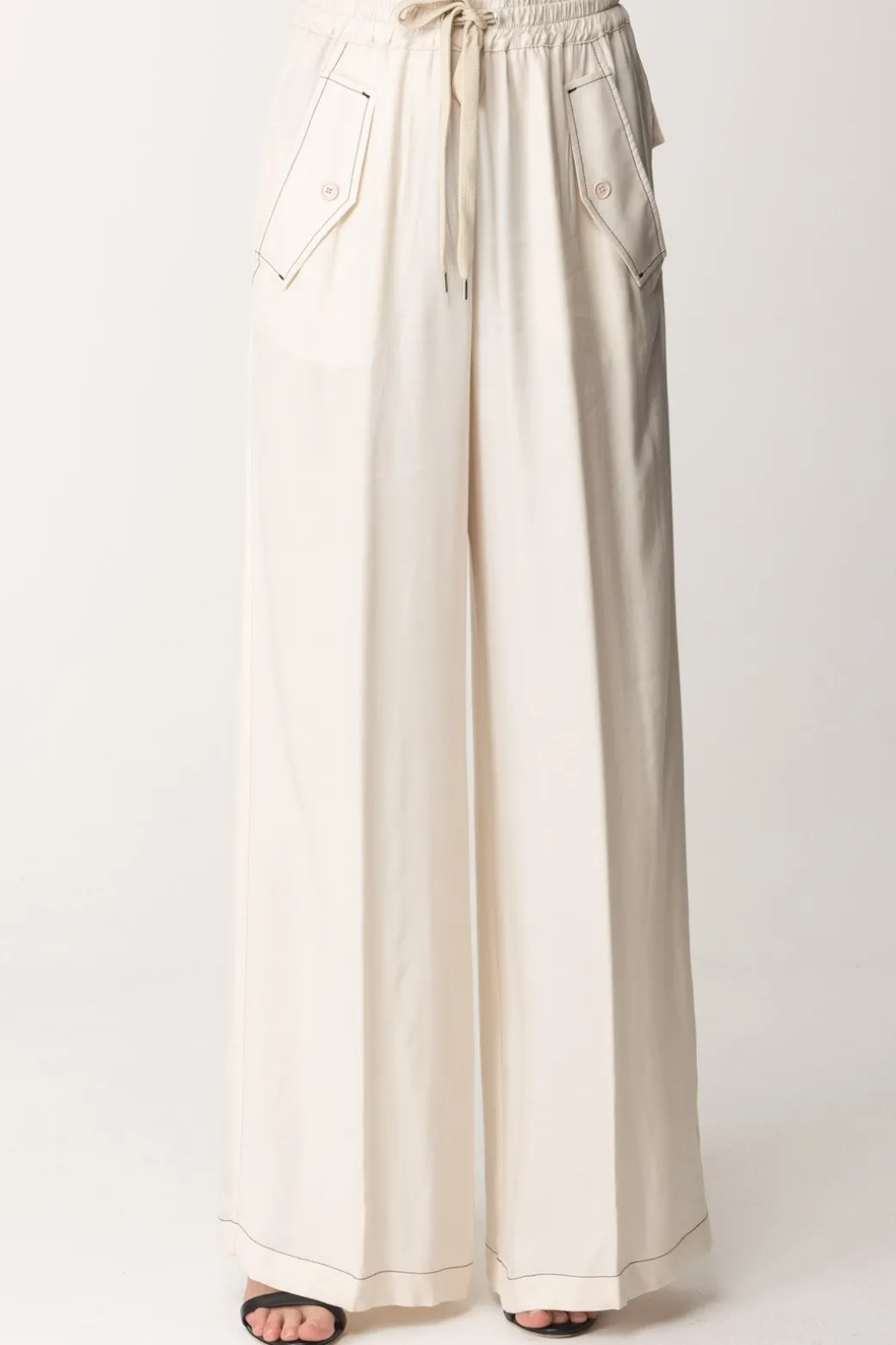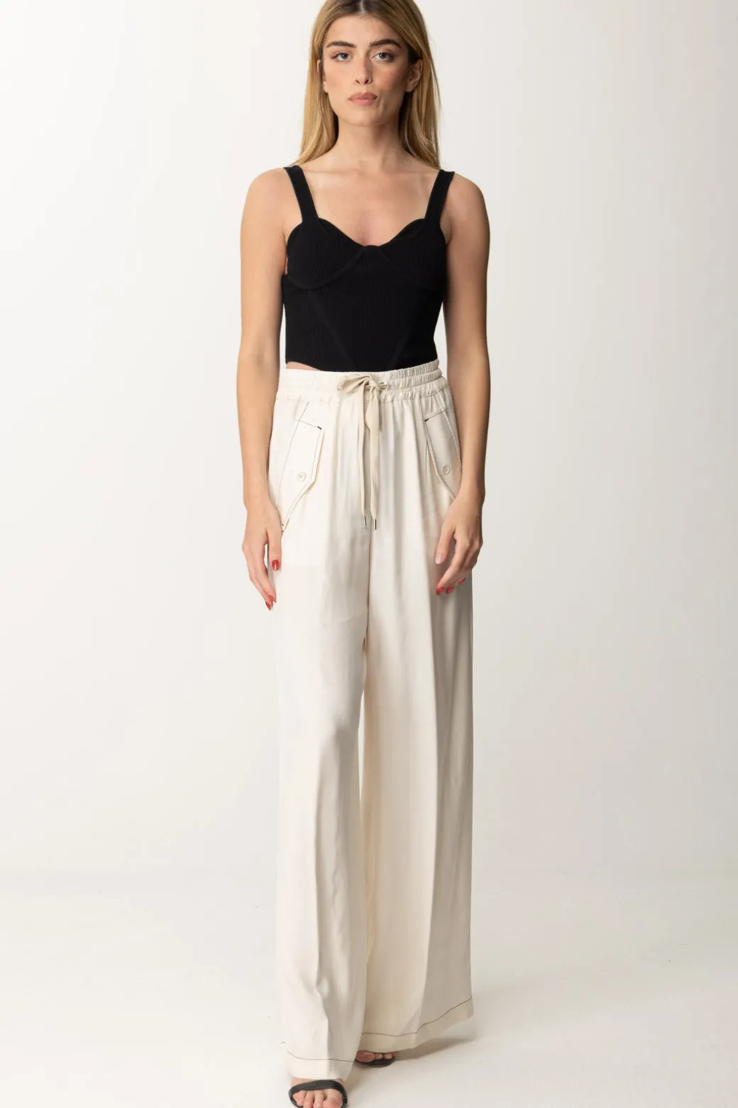 Questi pantaloni Pinko realizzati in twill, si distinguono per la loro linea wide leg, che conferisce una silhouette elegante e moderna. Le impunture a contrasto aggiungono un tocco di stile contemporaneo, mentre l’elastico in vita con coulisse da annodare offre comfort e una vestibilità personalizzata. Le tasche con patte su fronte e retro completano il look con un tocco pratico e alla moda.