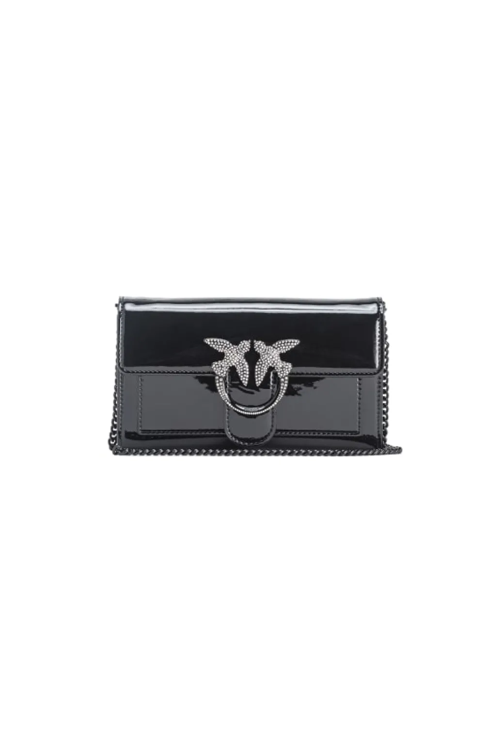 Non è del tutto una borsa ma neanche solo un portafogli: è infatti una perfetta wallet bag Pinko, ovvero un pratico portafogli da donna munito di tracolla e rifinito con spalmatura in simil vernice lucida e dal logo Love Birds con cristalli. Un accesorio minimal ma accattivante e flashy, che completerà alla perfezione i tuoi outfit da night-out.