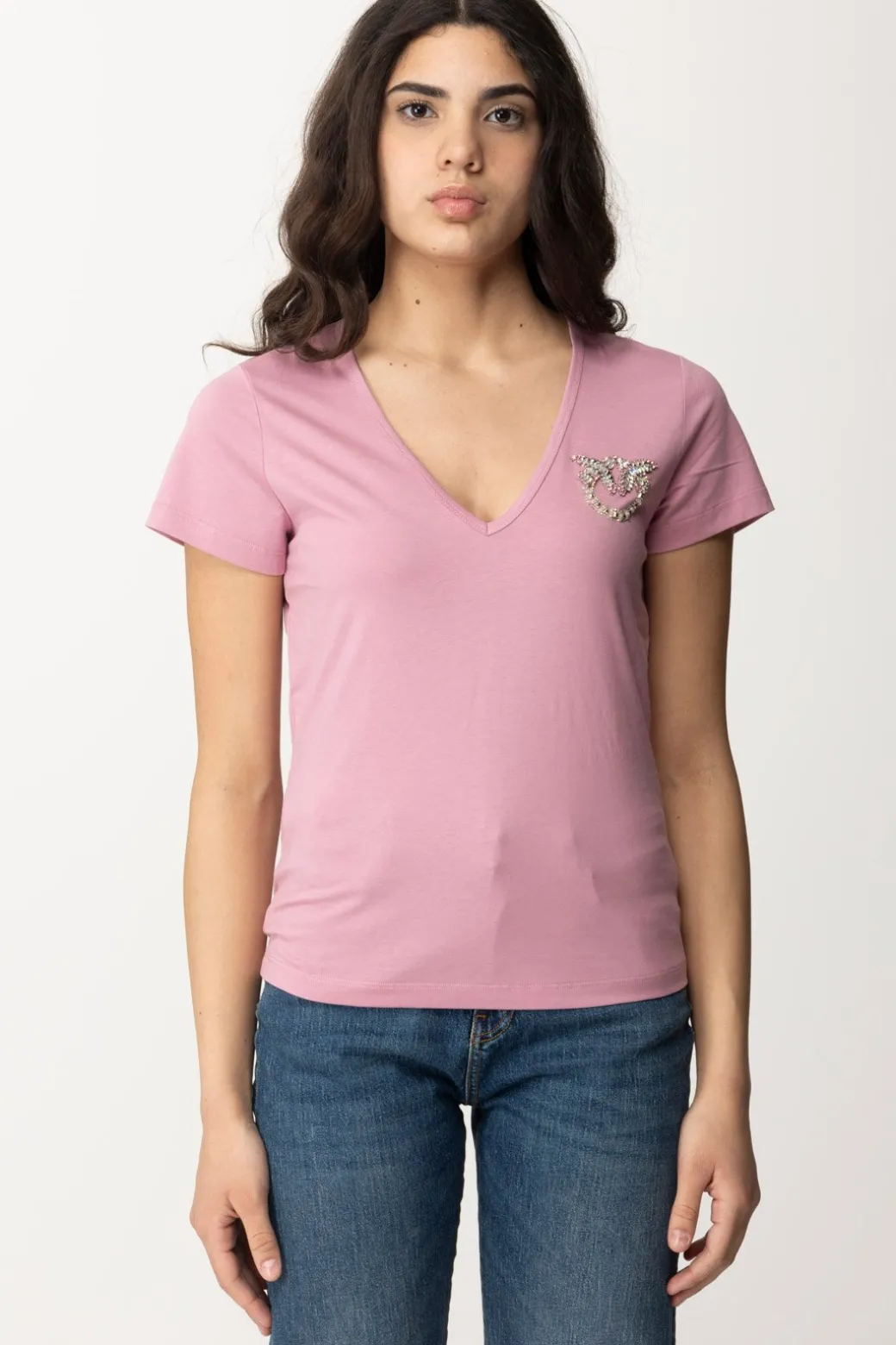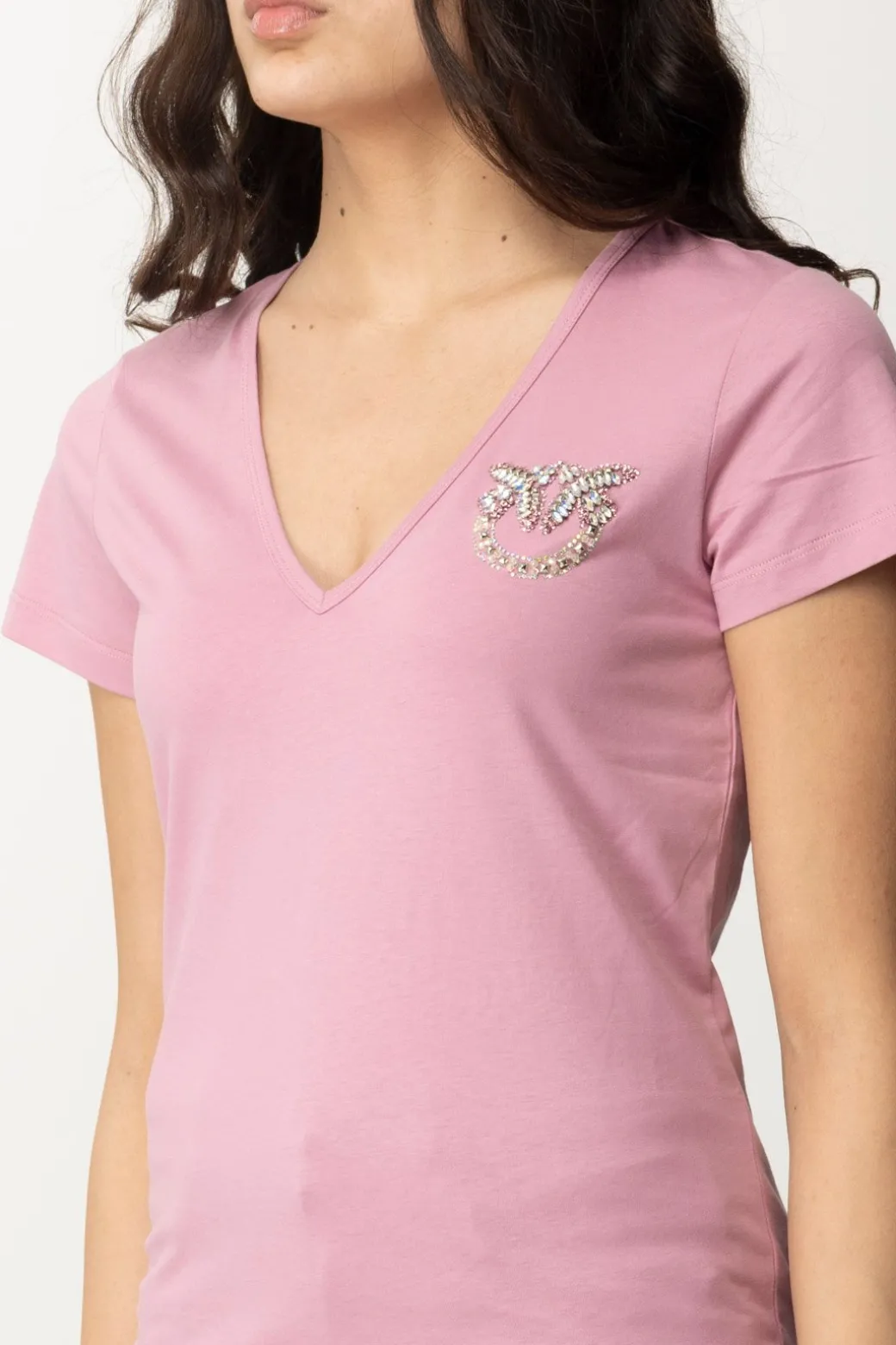 Must-have di ogni guardaroba, le t-shirt non mancheranno mai, qualunque sia il tuo stile o a seconda delle tendenze, basic quanto iconiche. Questa t-shirt Pinko si rende ideale da abbinare ad ogni look, impreziosita dal logo Love Birds tipico del brand ricamato con pietre sul petto. Un capo facile da usare da solo, come sottogiacca o cardigan come un vero e proprio passe-par-tout. Taglio regular