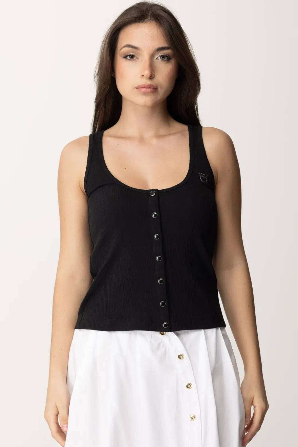 I top sono i must-have dell’estate, e questo top a canotta Pinko sarà sicuramente parte del tuo repertorio di capi basic preferiti. Semplice e fresca, impreziosita da bottoni frontali e logo Love Birds ricamato.