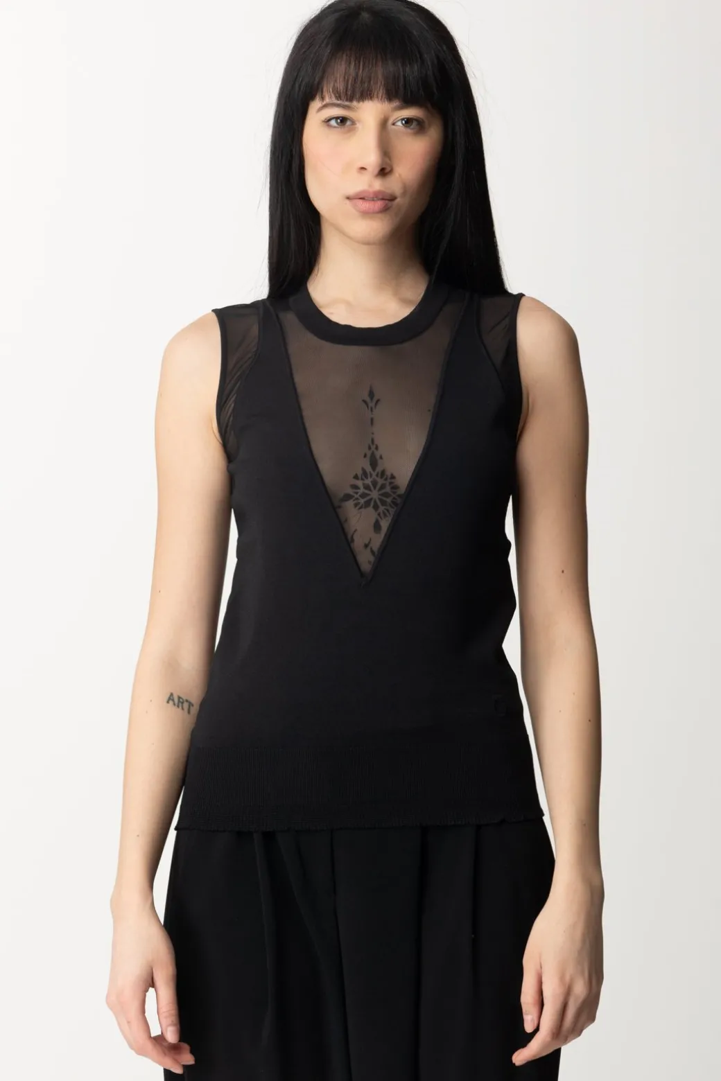 Sexy al punto giusto: questo top Pinko con il suo mix di maglia di viscosa e tulle è un vero e proprio disegno sulla tua silhouette, che gioca con il vedo-non vedo della scollatura a V profondissima! Bello da indossare in total black per un look ancora più affascinante, bella con bottom casual o colorati a cui aggiungere una nota di carattere.